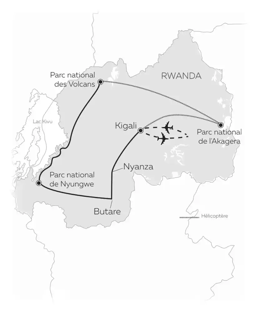 Ils ne sont pas seuls, d’autres primates vivent dans ce dense écosystème, comme les singes dorés, assez rares et que vous observerez également. Le Rwanda est un pays qui œuvre activement pour la protection de ses fragiles écosystèmes et a réussi une transition vers une véritable conservation environnementale. Vous aurez l’occasion de visiter un village d’anciens braconniers désormais investis dans la protection des primates. Puis en hélicoptère, survolez la forêt infinie pour rejoindre le parc national de l’Akagera, propice à de nouvelles rencontres riches en émotions. Vous partirez en 4 × 4 en safari jour et nuit débusquer antilopes, buffles, girafes, zèbres, léopards, peut-être des lions. Puis naviguez en bateau sur le lac Rwanyakazinga pour approcher hippopotames, crocodiles et colonies d’oiseaux, avant de rejoindre Kigali, la capitale vibrante de ce petit pays attachant.