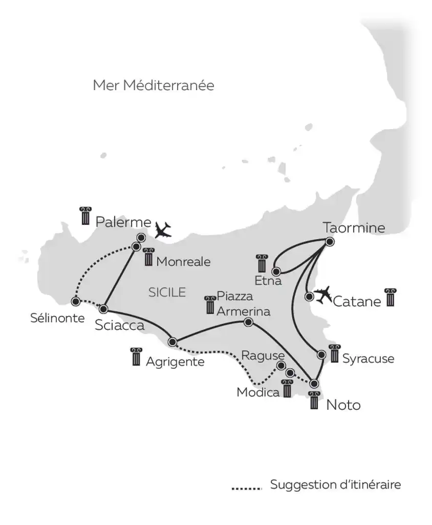 Mais la Sicile est aussi une terre d’histoire et d’architecture aux multiples quartiers et édifices classés au patrimoine mondial par l’UNESCO. Parmi les plus remarquables, explorez les majestueuses cathédrales arabo-normandes à Palerme et Monreale. Dans la capitale, admirez les palais opulents qui ont inspiré Paolo Visconti pour tourner Le Guépard, tel que le palais des Normands avec sa chapelle palatine byzantine aux mosaïques dorées grandioses. En remontant dans le temps, admirez les cités gréco-romaines de Sélinonte et la fabuleuse vallée des Temples à Agrigente. À Syracuse, laissez-vous subjuguer par la belle Ortygie et ses magnifiques palais Renaissance. Votre voyage architectural se terminera parmi les joyaux baroques de l’île : l’époustouflante Raguse, Modica, Noto et Taormine, où vous séjournerez dans le très prestigieux Domenico Palace.