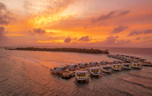 Le paradis des plongeurs et amateurs de snorkeling ! Érigées sur pilotis, ces élégantes villas contemporaines de 125 m² bénéficient d’un emplacement privilégié sur le lagon, offrant une intimité optimale. Leur vaste terrasse en bois aménagée invite à profiter pleinement du cadre marin enchanteur. Elle est équipée d’un canapé avec une table basse et un fauteuil, de lits de plage individuels et d’une somptueuse piscine à débordement qui semble se fondre dans l’océan.