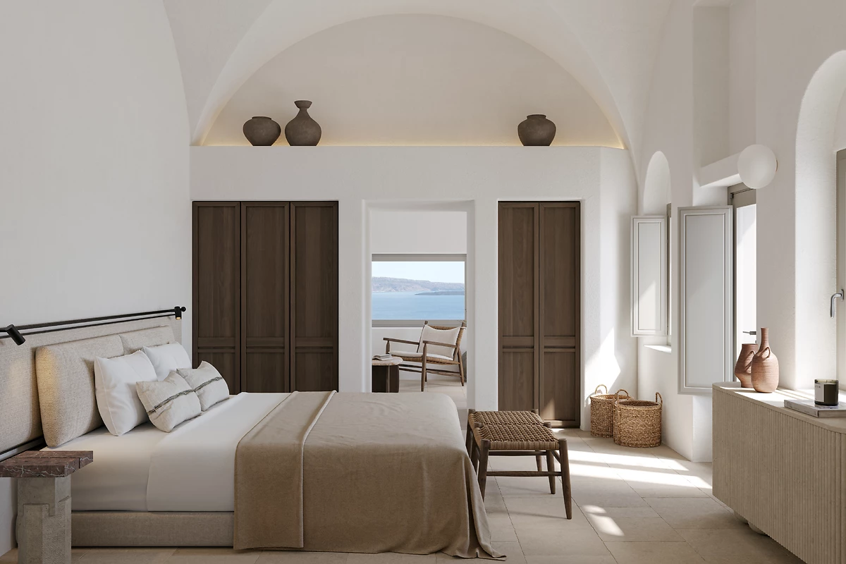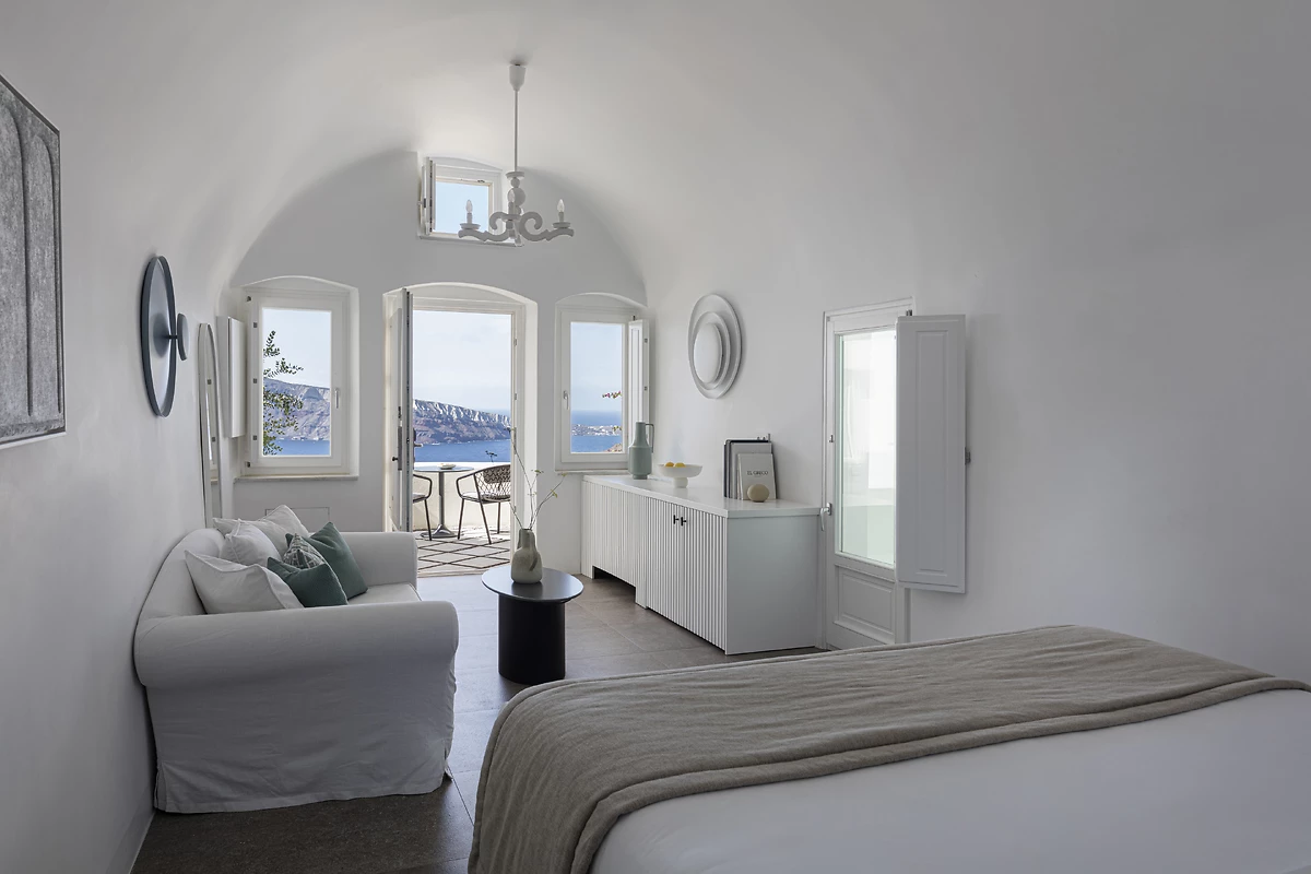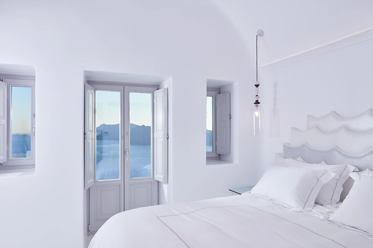 Chambres surplombant la caldeira depuis leur terrasse dont une suite master avec piscine à débordement et une suite lune de miel avec bassin.
