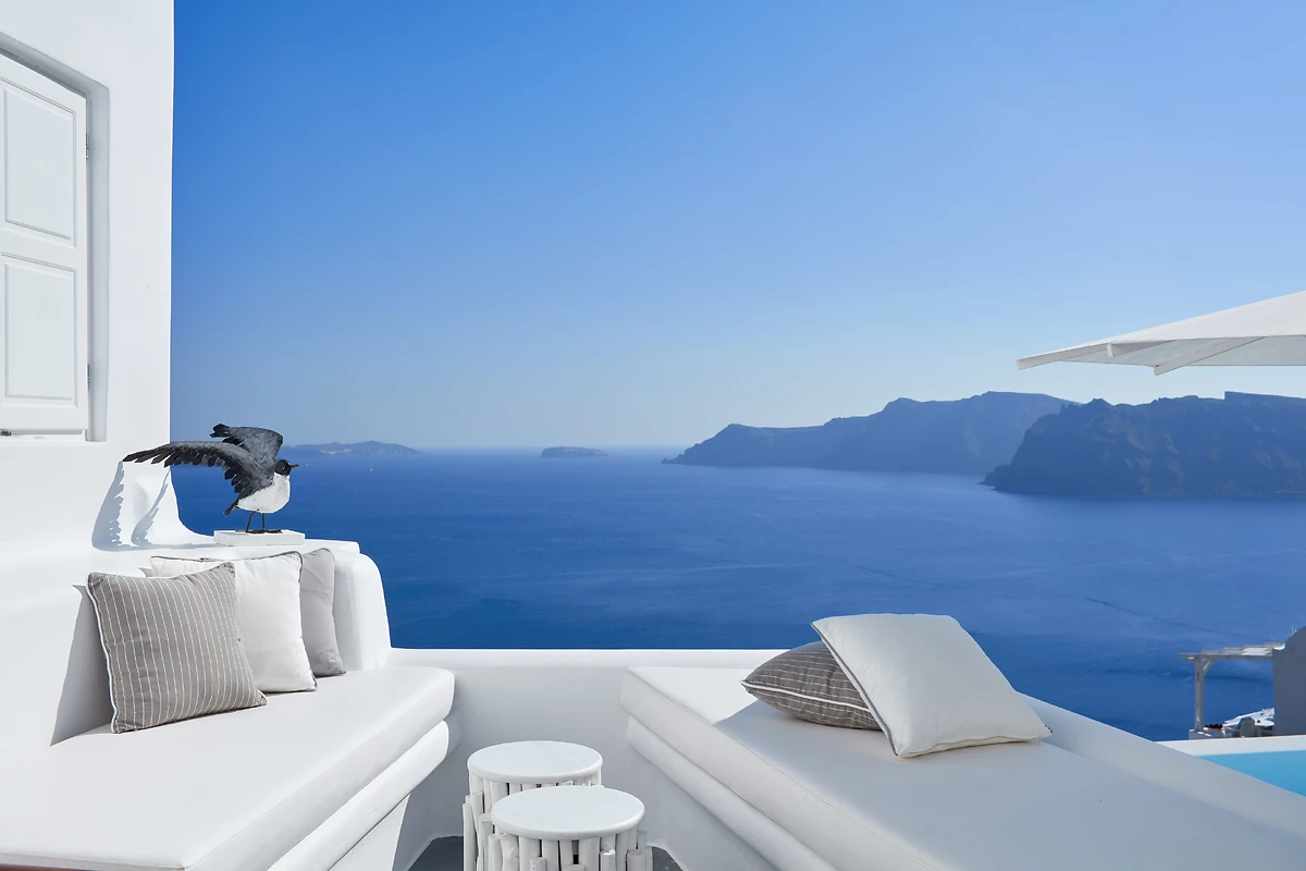 Suites surplombant la caldeira depuis leur terrasse dont une suite master avec piscine à débordement et une suite lune de miel avec bassin.