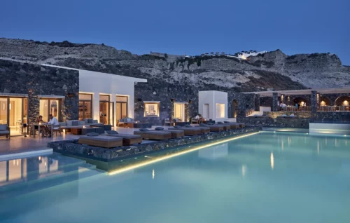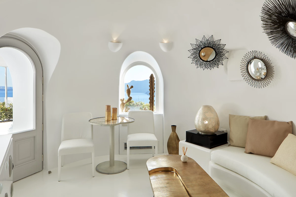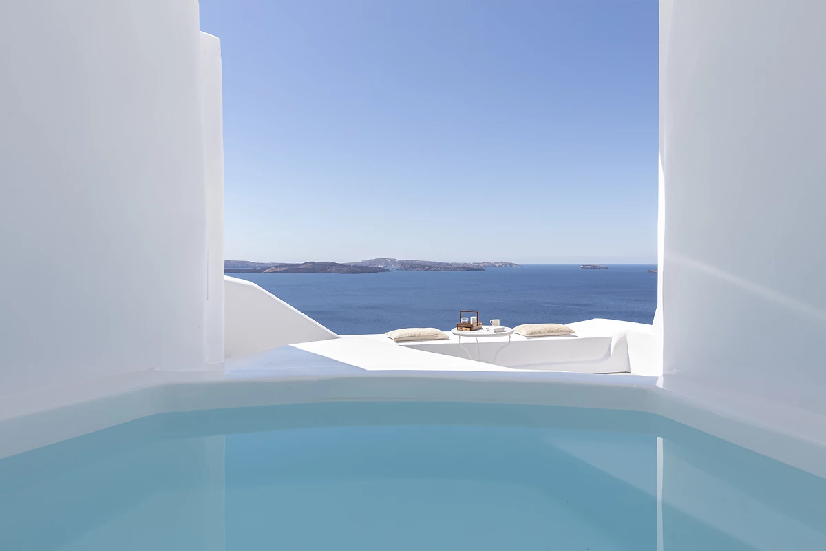 44 suites avec vues sur la caldeira, toutes avec un espace salon, une terrasse avec petite piscine privée de type bassin profond. La piscine de l’une d’entre elles se prolonge jusque dans la salle de bains.