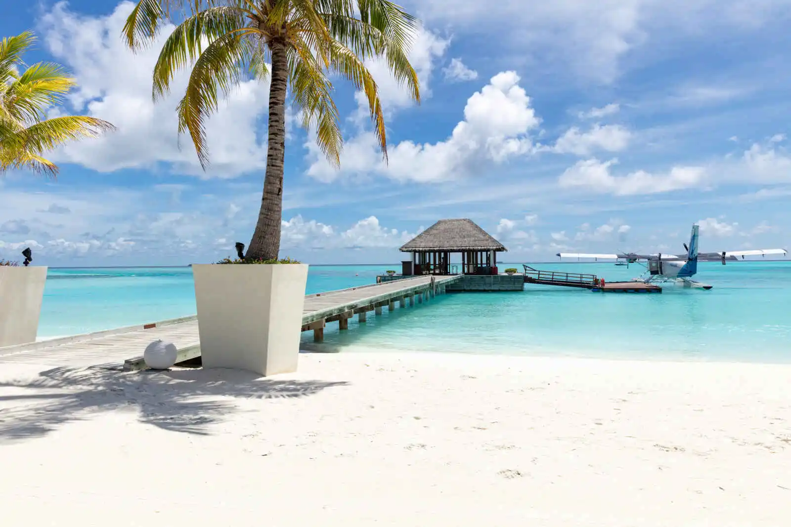 La terrasse mi-ombragée accueille un véritable salon extérieur avec un espace dinatoire, une belle piscine de 73 m² avec la bain à remous intégré, une balançoire en forme de dhoni, le bateau traditionnel maldivien, ainsi qu’un élégant coin détente. Les transats, placés directement sur la plage, invitent à profiter du sable fin et des eaux turquoise du lagon.