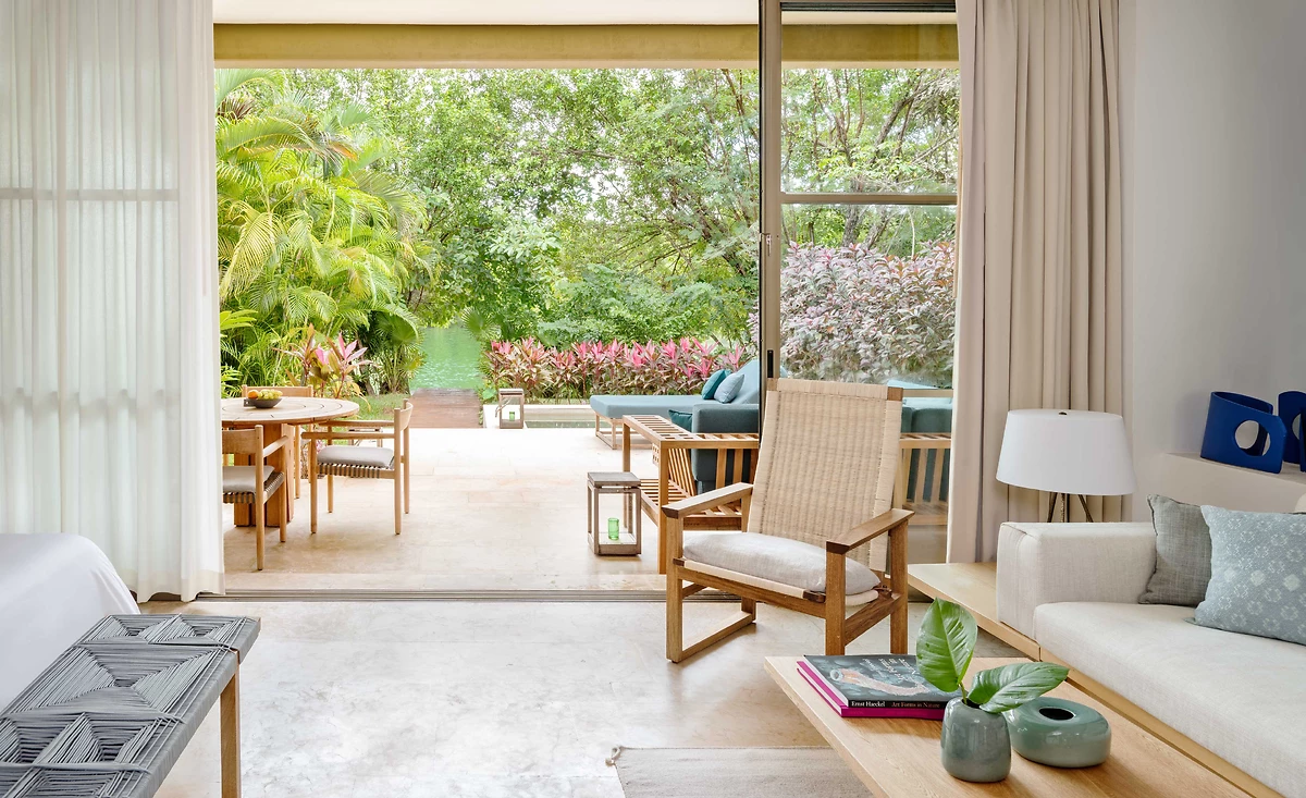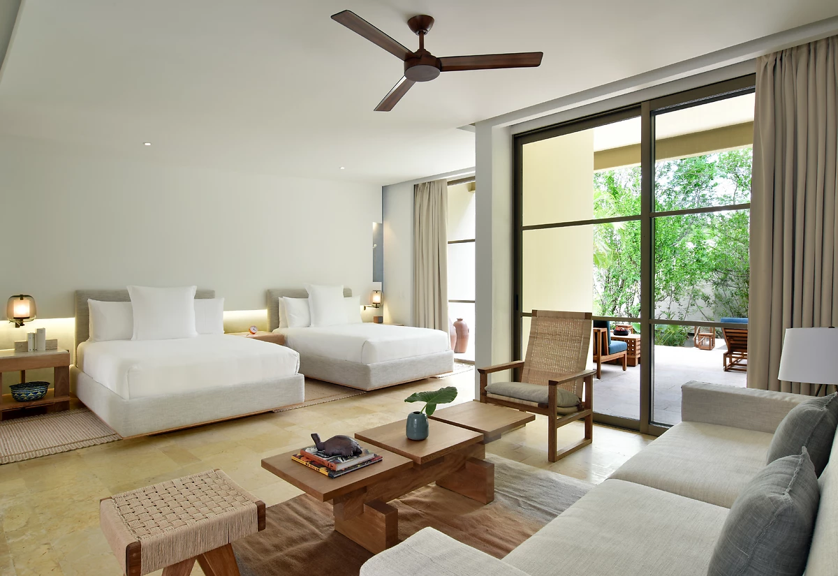 129 suites et villas immergées dans un environnement tropical, mêlant confort et authenticité. Les intérieurs sont sophistiqués, avec des pièces de mobilier fabriquées par des artisans mexicains, ainsi que quelques subtils clins d’œil à la culture maya. Toutes sont climatisées, équipées d’une terrasse spacieuse, d’un bassin ou d’une piscine privée, d’une salle de bains avec douche extérieure et d’un service de majordome.