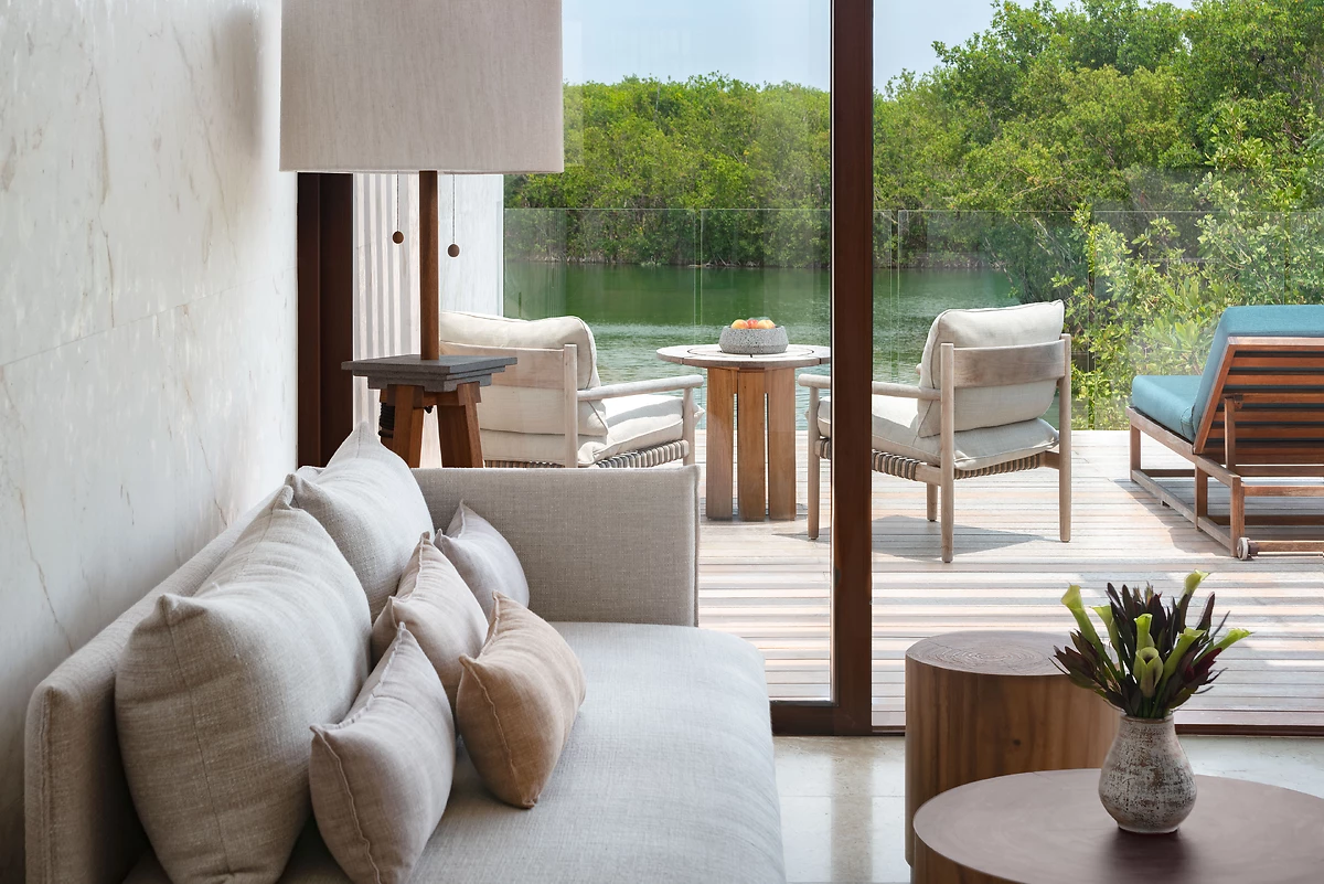 Suite d’une superficie de 90 m², avec salon, vue lagon et mangrove.