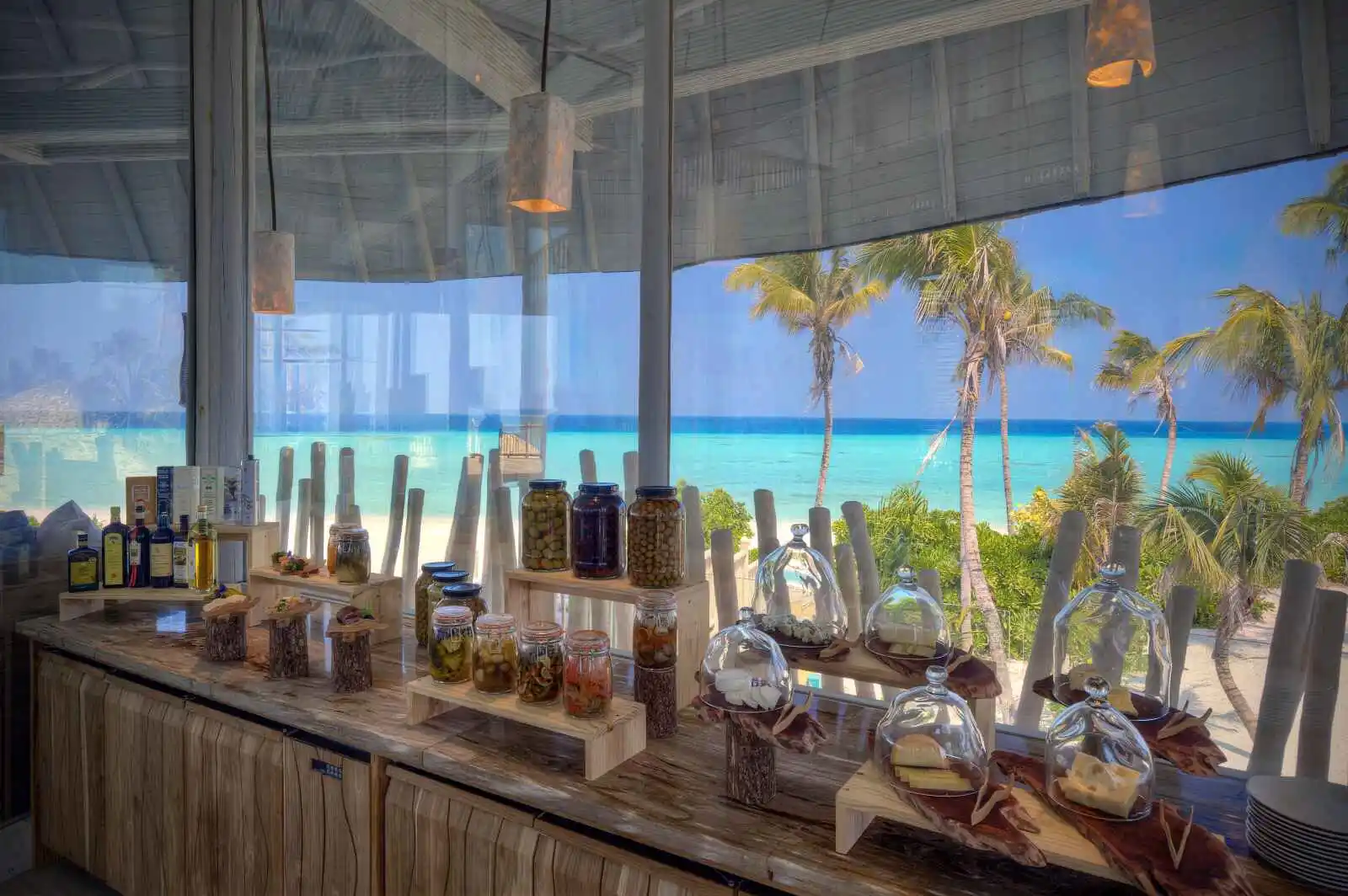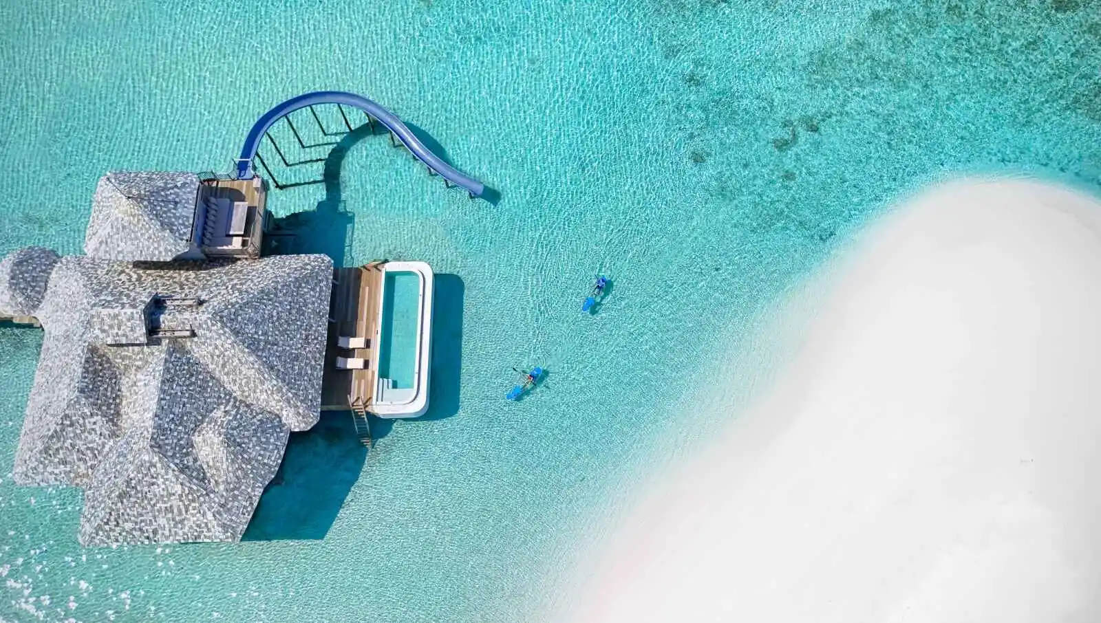 Au rez-de-chaussée, on trouve également une salle de sport entièrement équipée, une cuisine moderne et un garde-bagages. Le premier étage abrite un espace de soins Spa, un coin dinatoire en extérieur et un toboggan aquatique donnant accès direct au lagon.