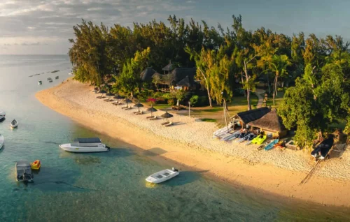 Vue aérienne de la plage, The Oberoi Beach Resort Mauritius, Maurice