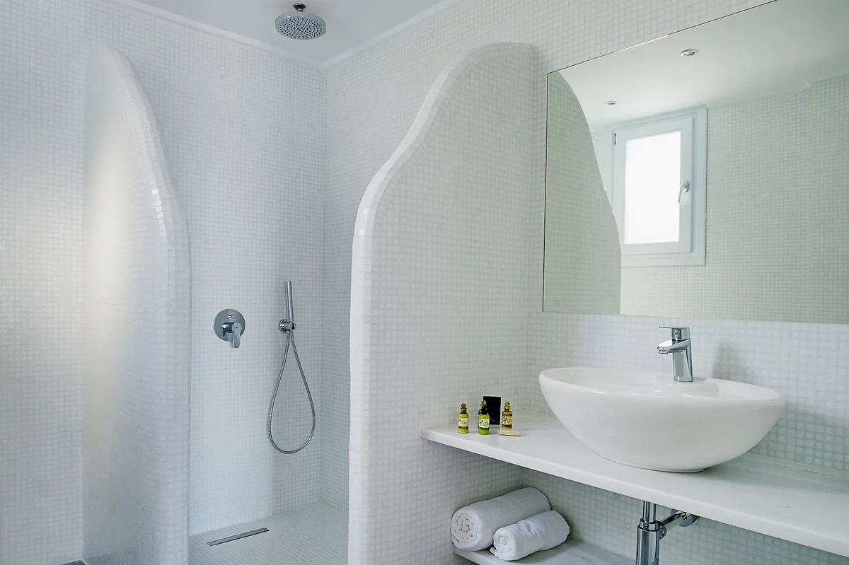 D’une superficie de 30 m², la suite junior est située au rez-de-chaussée ou à l’étage et peut accueillir deux adultes qui profiteront d’un lit king-size. Décorée dans des tons clairs, elle dispose aussi d’un balcon qui offre une jolie vue sur le jardin de l’établissement et le village d’Akrotiri.