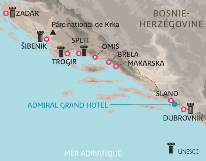 Niché dans la magnifique et intacte baie de Slano, dans un cadre des plus paisibles, l’Admiral Grand Hotel, proposé d’emblée en demi-pension, offre des prestations de qualité : des chambres spacieuses avec balcon, plusieurs restaurants et bars, un Spa avec piscine intérieure, divers équipements sportifs et, enfin, une plage privée aménagée idéale pour la baignade dans les eaux calmes de la baie.