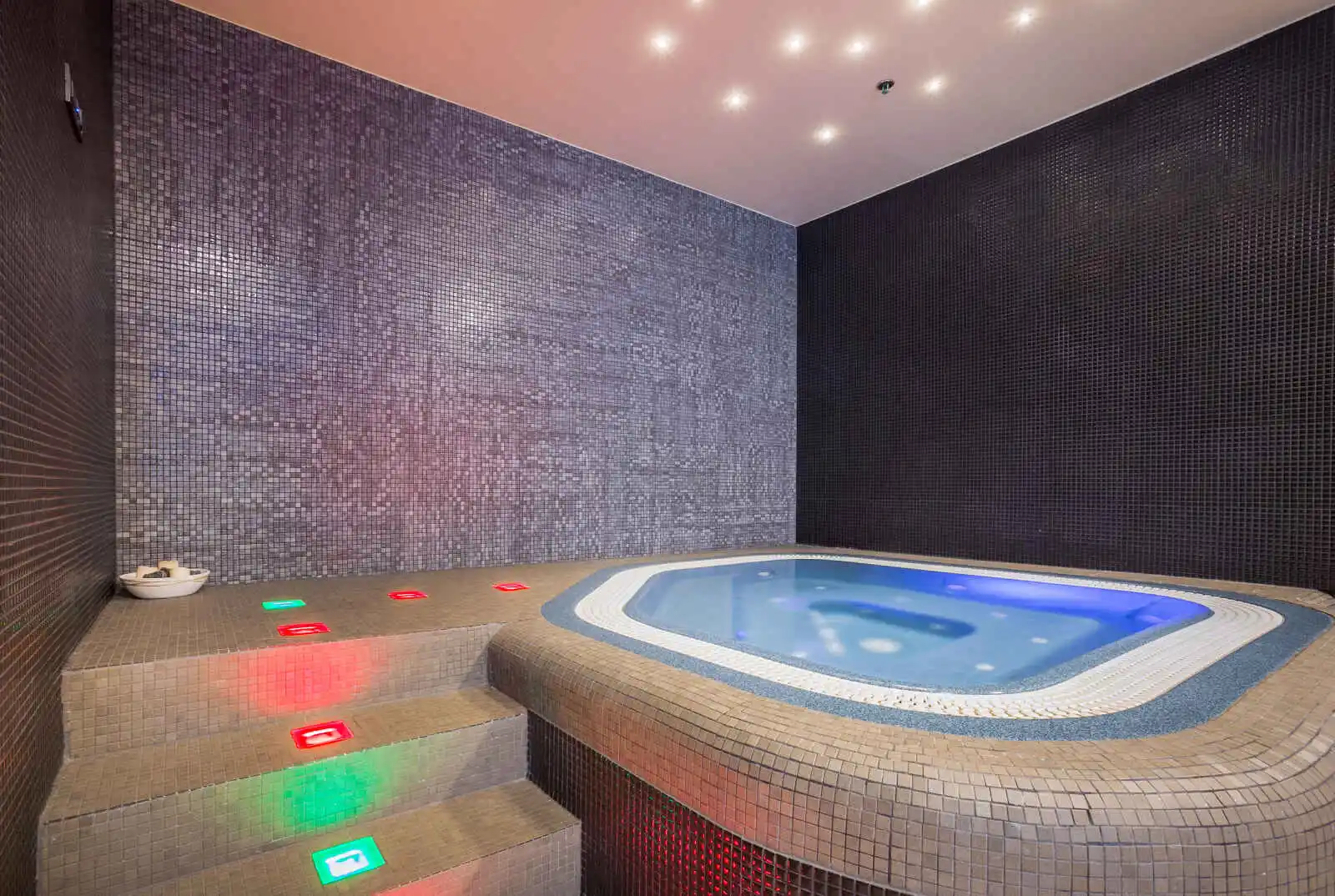 Spa comprenant une grande piscine intérieure d’eau de mer chauffée, hammam, sauna, douche sensorielle et bain à remous, en accès libre.