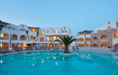 Situé à l’est de Santorin, cet établissement de style cycladique d’un blanc éblouissant est niché dans le village balnéaire de Kamari. Il est idéal pour profiter de sa plage de sable noir et vivre au ryhtme des Santorinois en jouissant de l’animation de ses restaurants, bars et petits commerces en bord de mer.