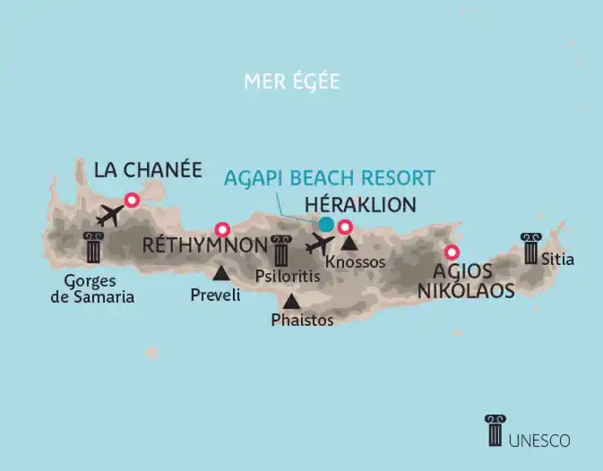 Situé non loin d’Héraklion, au cœur de la Crète, posé au milieu de ses jardins, l’hôtel Agapi Beach Resort fait face à la mer et à une jolie plage de sable blond. Point de départ rêvé pour toutes les excursions de par sa situation très centrale sur l’île, c’est un lieu de séjour idéal pour toute la famille – et d’autant plus avec son offre tout compris. Il offre une belle qualité d’hébergement et de services.