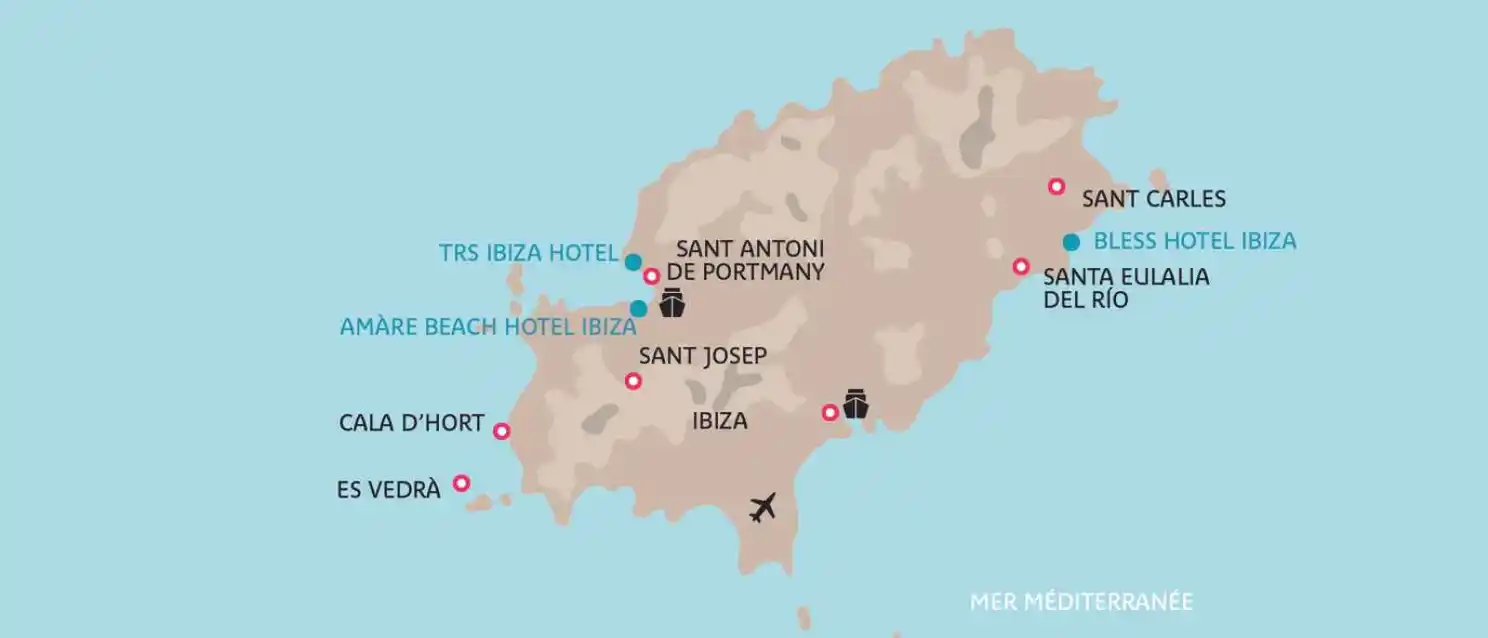 A Sant Josep de sa Talaia, sur la côte ouest de l'île, face au port de Sant Antoni de Portomany (navette bateau), à 18 km de l'aéroport.