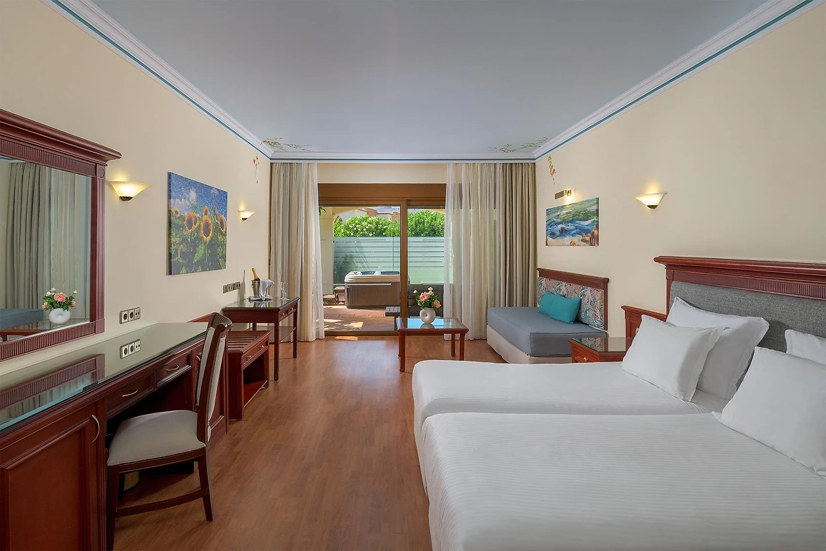 Chambre double (28 m², 2 adultes + 1 enfant), en rez-de-jardin avec piscine privée, avec un petit espace salon et un canapé-lit