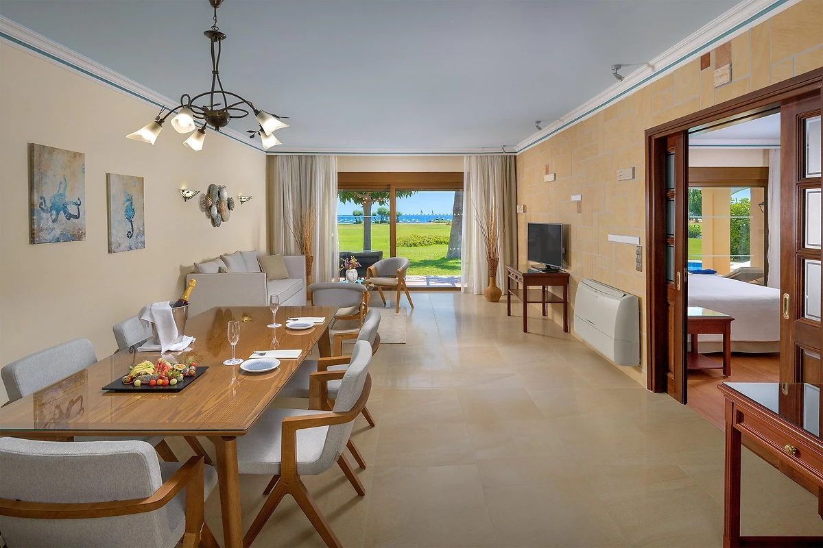 Suite junior (39 m², 2 adultes + 1 enfant) vue mer, avec un espace salon en continuité équipé d’un canapé-lit