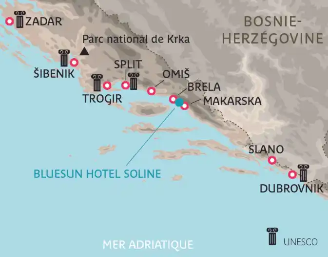 L’Hôtel Bluesun occupe une avancée sur la mer, qui lui offre une vue imprenable sur l’Adriatique, à proximité immédiate de la belle plage de Punta Rata. Son architecture en cascade et ses formes pures s’intègrent parfaitement aux lignes des montagnes en arrière-plan. Le style résolument contemporain des parties communes et des chambres où se mêlent pierre, verre et bois confère un effet zen des plus naturels. Plusieurs bars et restaurants offrent une grande variété gastronomique. Un vaste espace Spa, plusieurs piscines ainsi qu’un programme d’activités pour les enfants complètent les aménagements de cette adresse.