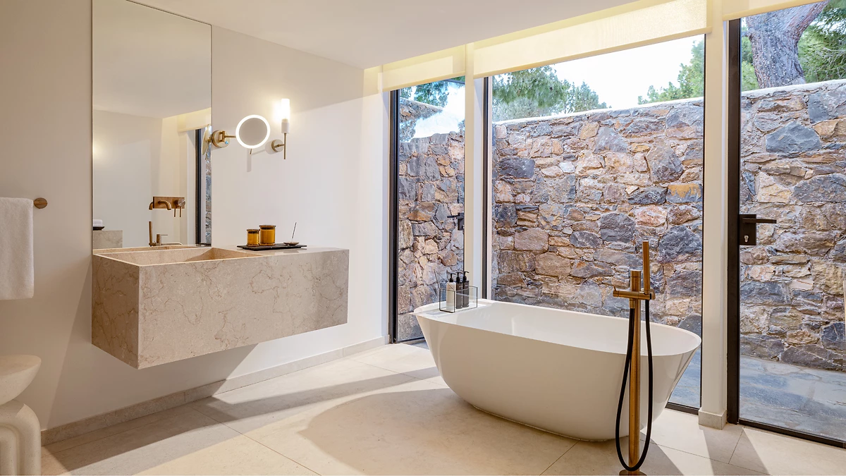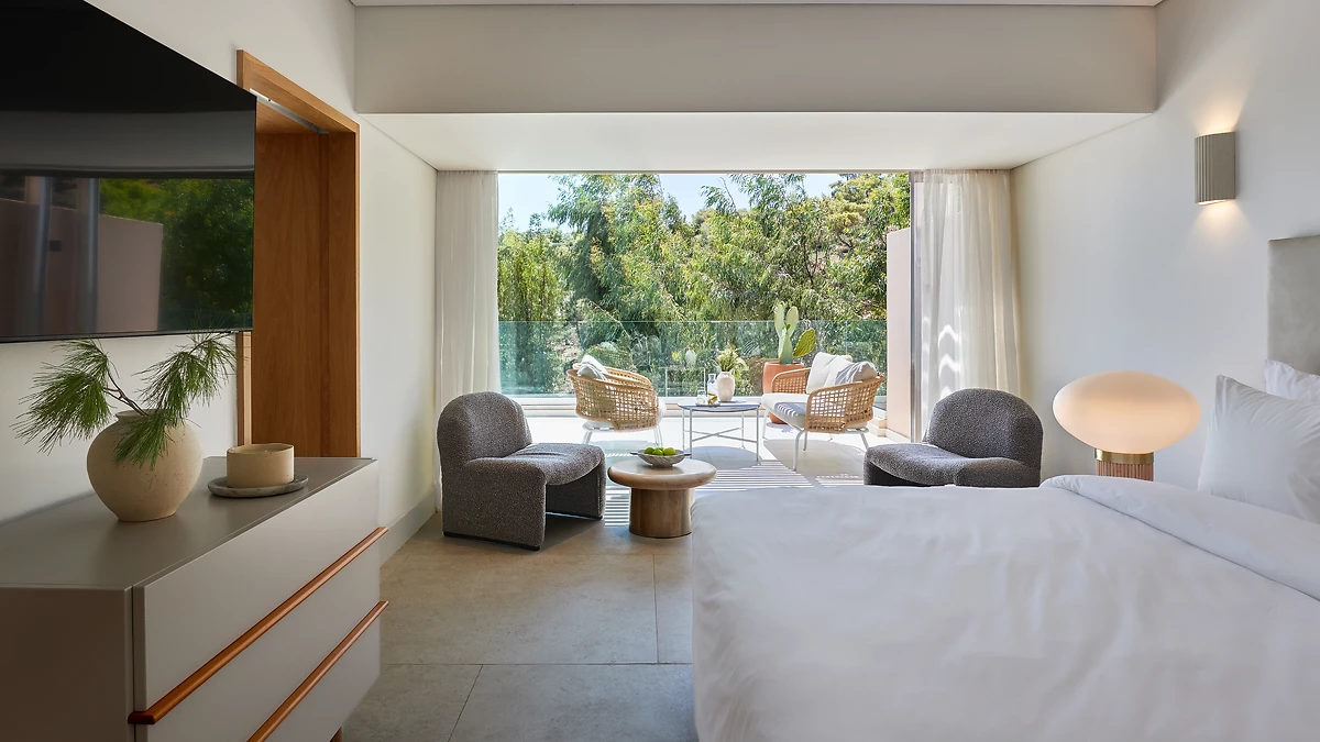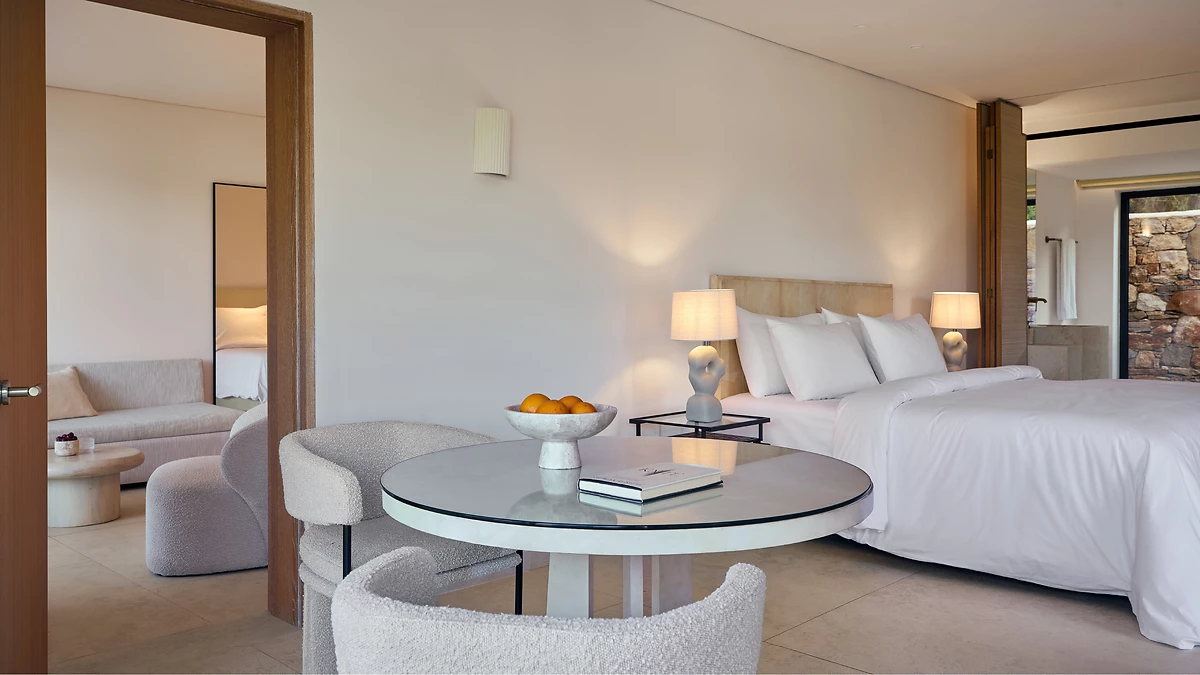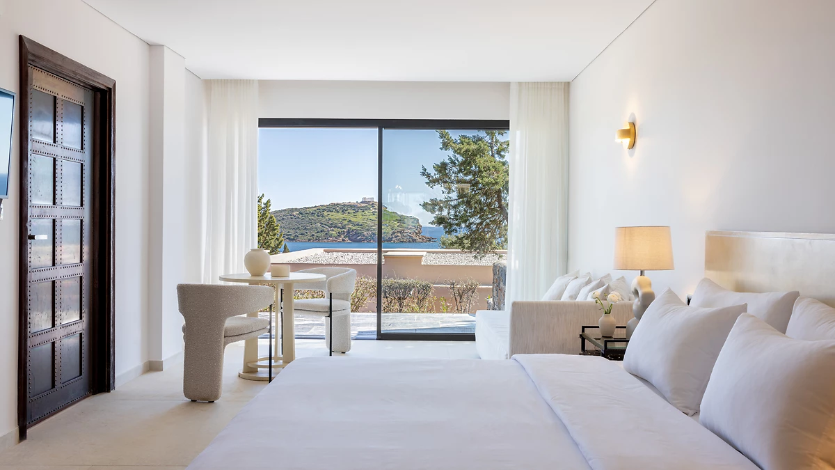 D’une superficie de 45 à 50 m², la chambre familiale peut accueillir 2 adultes et 2 enfants ou 3 adultes et 1 enfant, grâce à une chambre séparée et deux canapés dans la partie salon. Très lumineuse avec sa grande baie vitrée et joliment décorée, elle possède 2 salles de bain avec douche et s’ouvre sur une terrasse une vue partielle sur la baie du Cap Sounion et la mer.