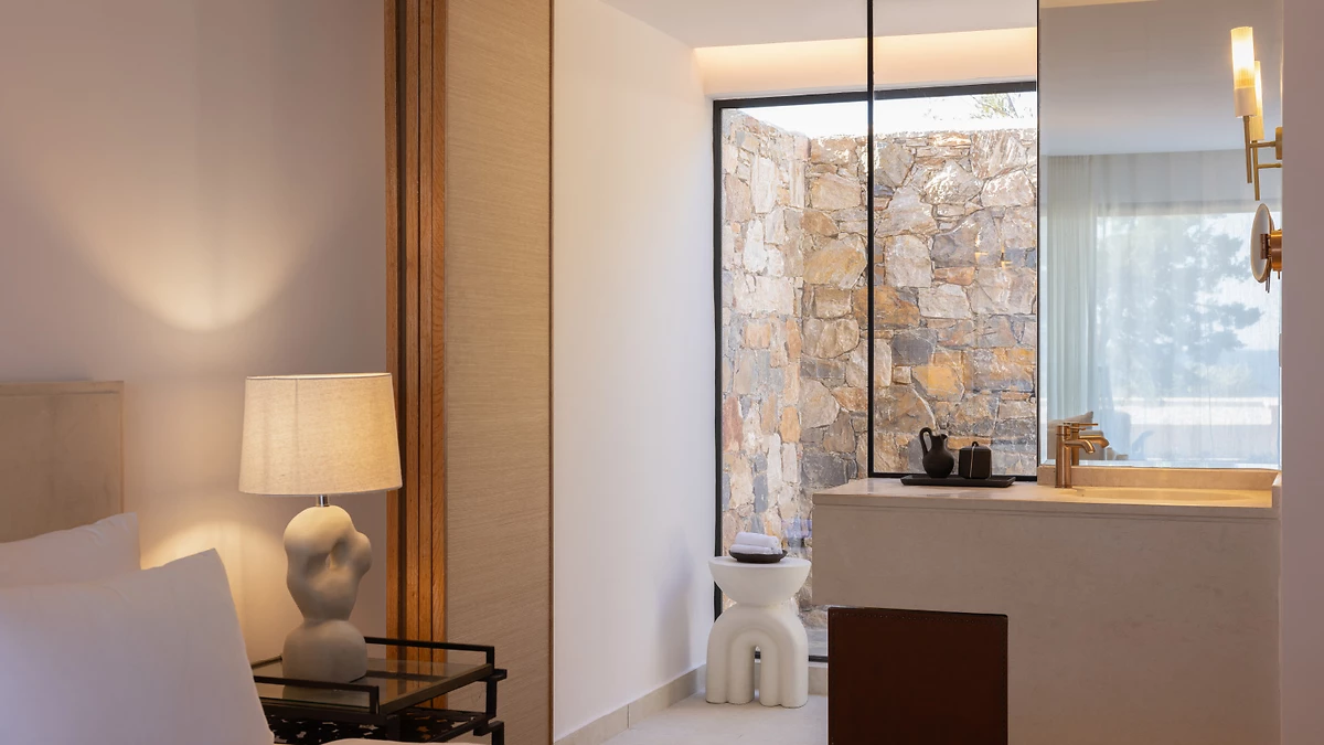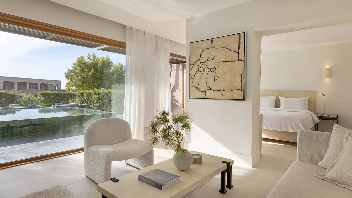 Suite junior de 50 m², pouvant accueillir jusqu’à 3 adultes, avec accès directe à la piscine partagée. Vue sur le temple et la mer.