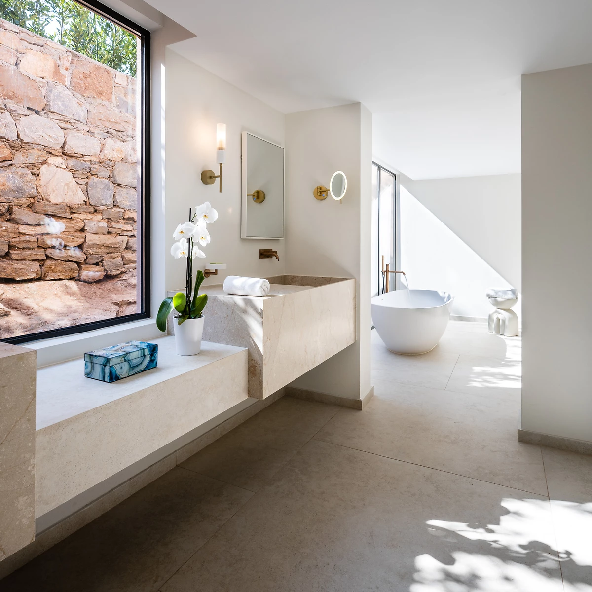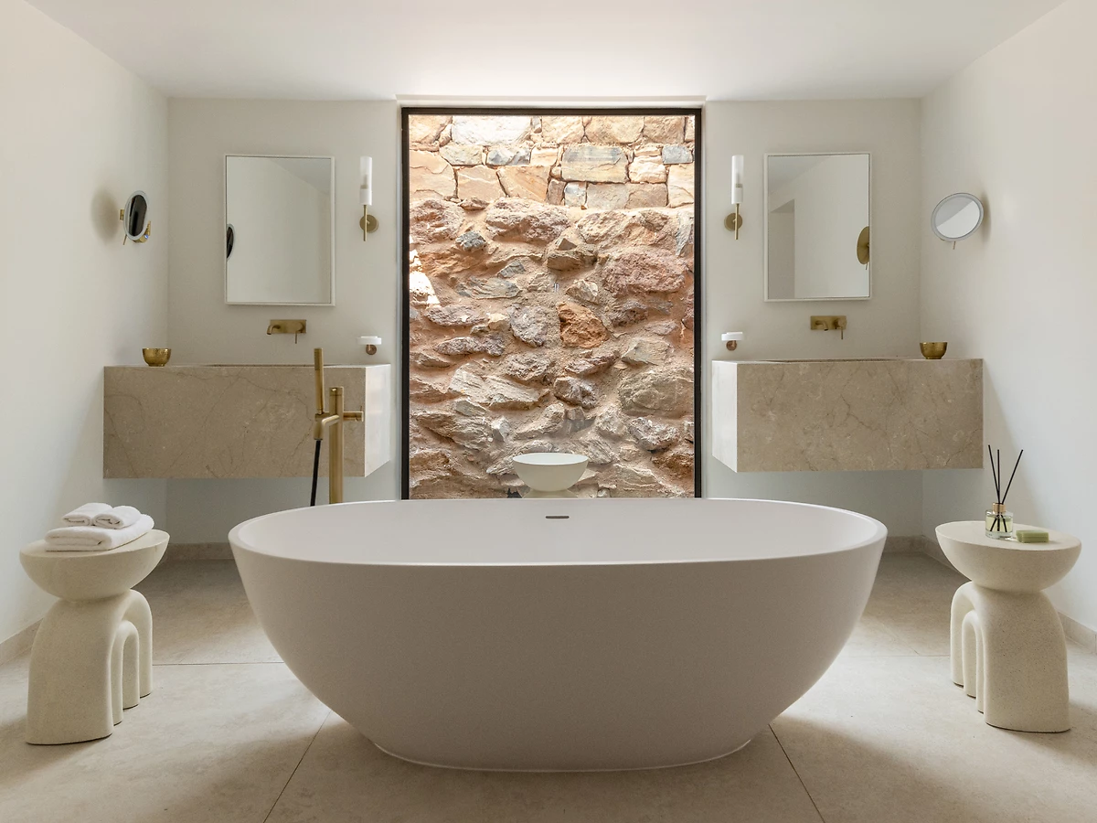 Suite de 50 m², pouvant accueillir jusqu’à 3 adultes avec un lit double et un canapé-lit. Une piscine extérieur et une vue sur le temple et la mer.