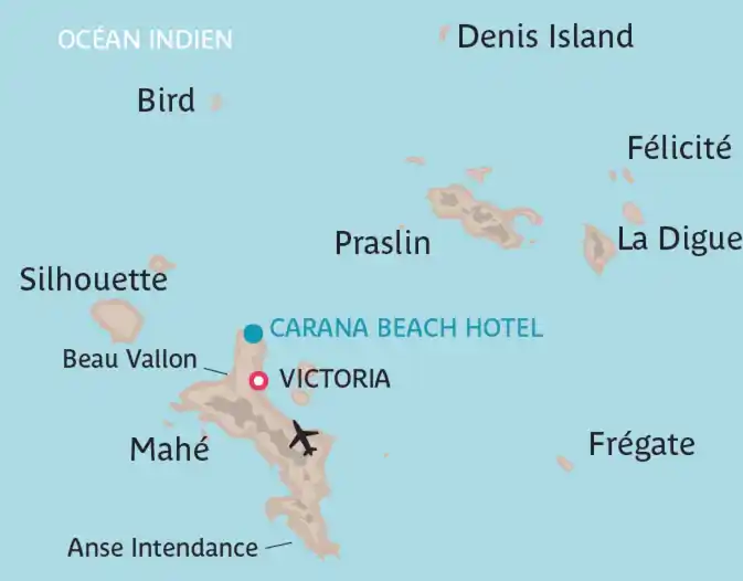 À 25 min de l’aéroport, sur la pointe nord de Mahé, à flanc de colline devant la plage de Carana.