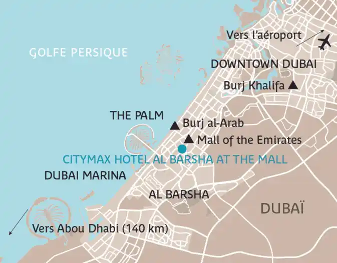 L’hôtel Citymax est situé dans le quartier d’Al Barsha, à seulement 2 minutes à pied du Mall of Emirates, un des temples du shopping. Vous pourrez également vous laissez tenter par les joies du ski au Ski Dubai !
