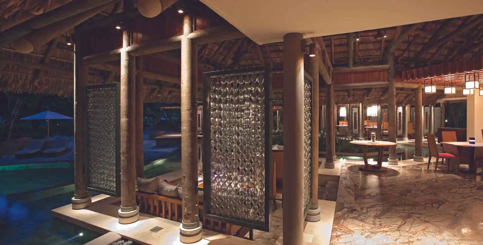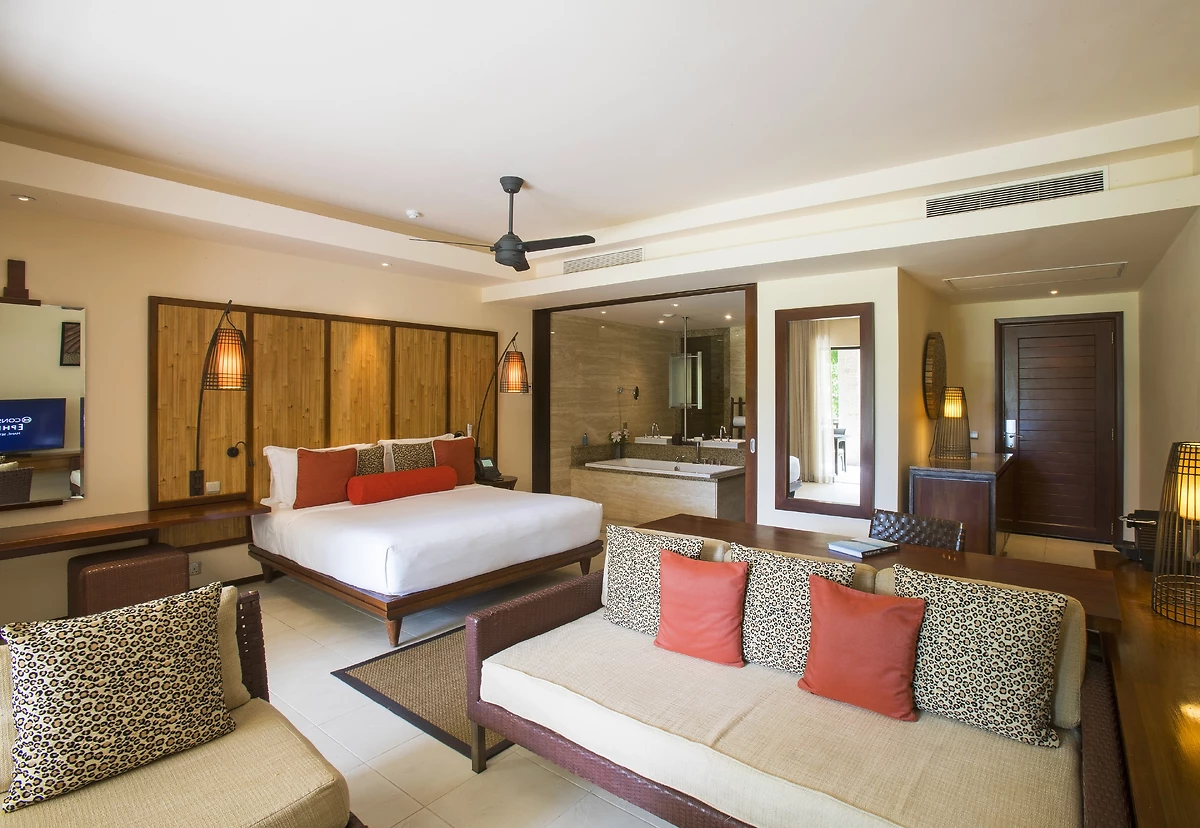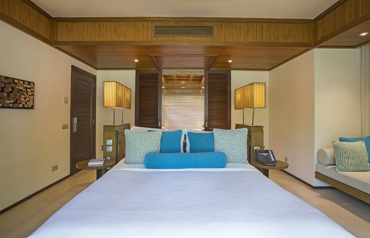 Ces suites de 62 m² sont conçues pour accueillir 2 adultes avec la possibilité d’ajouter un lit pour un enfant de moins de 13 ans. Situées à quelques pas de la plage, elles offrent une prestation haut de gamme et un confort optimal, avec un accès direct aux jardins paisibles de l’île. Décorées avec des éléments décoratifs et mobilier en bois, les suites disposent d’un lit king-size, d’un coin salon, d’un bureau ainsi que d’un espace mini-bar. La chambre ouverte est dotée de grandes portes-fenêtres donnant sur une terrasse aménagée et partiellement ombragée. La salle de bains s’ouvre sur une arrière-cour verdoyante et à l’abri des regards. Elle est équipée d’une grande baignoire, d’une cabine de douche, de toilettes séparés et d’un double vasque. Chaque suite dispose d’une machine à café Nespresso avec des capsules fournies.