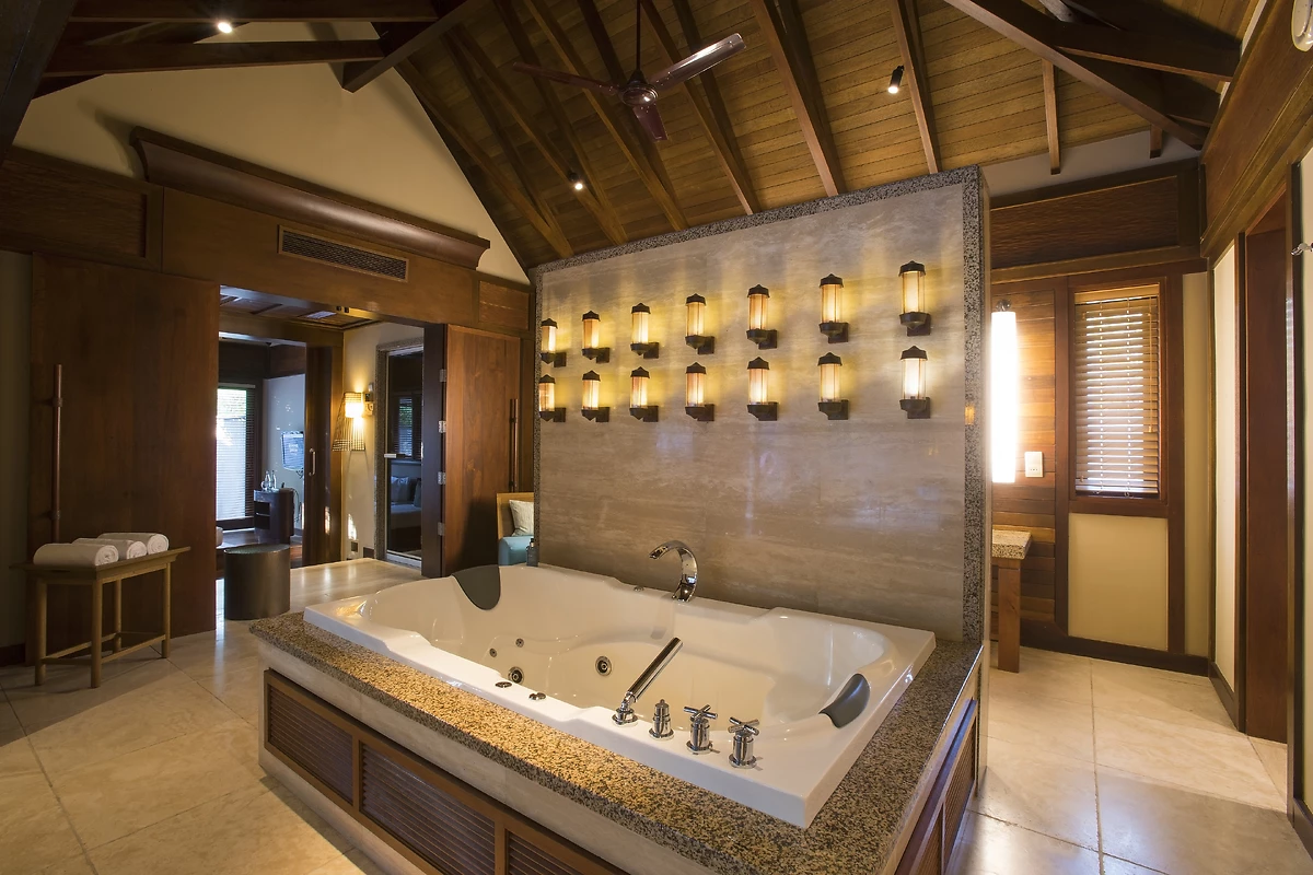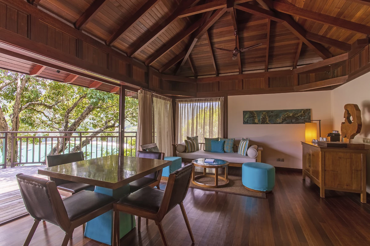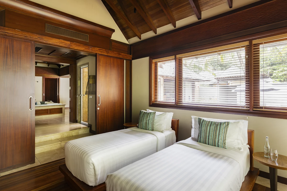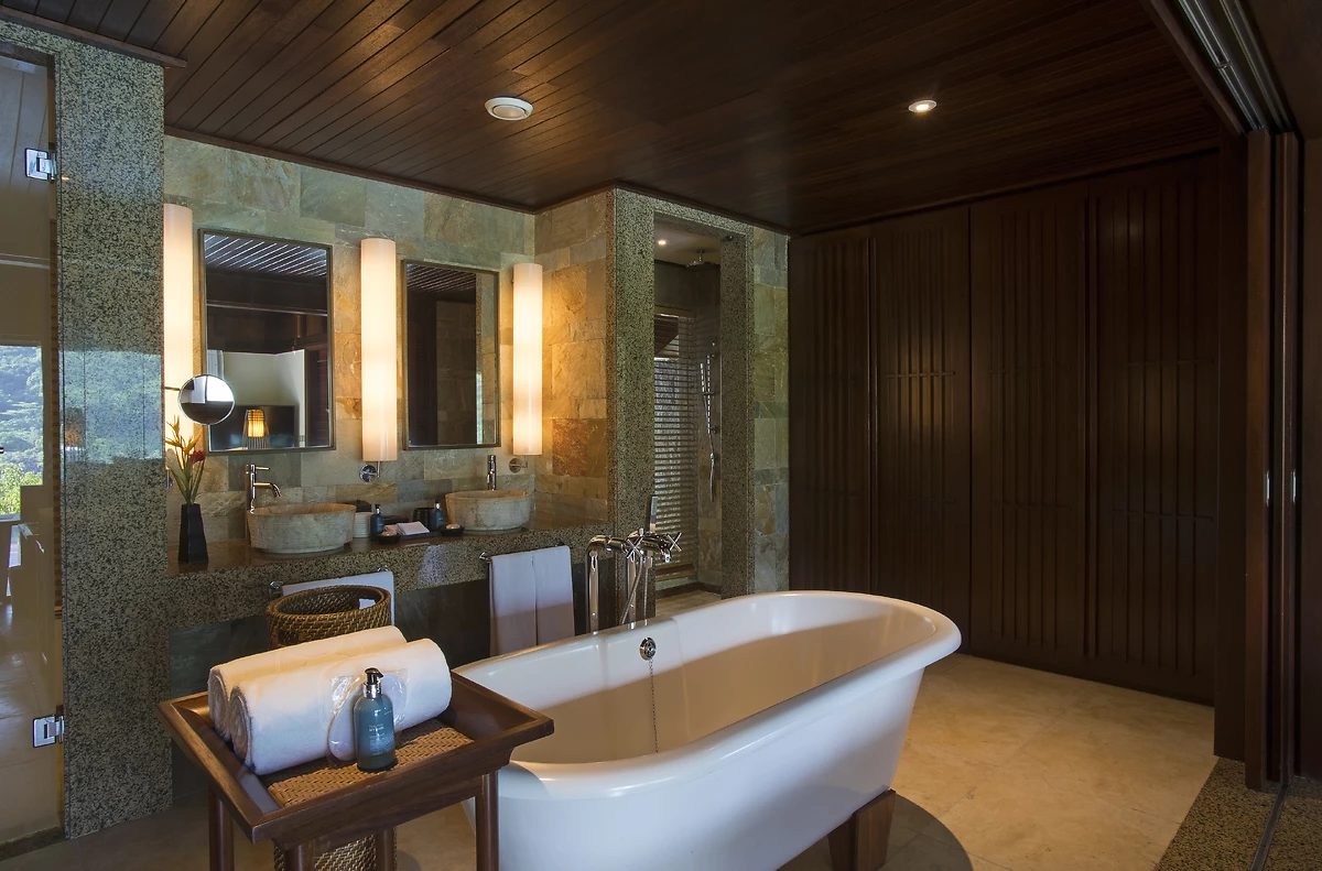 Ces vastes villas de 185 m² ont le privilège d’être situées à quelques pas seulement de la plage nord de Port Launay, l’une des plus belles de Mahé, sur laquelle s’étend le domaine de l’hôtel. Dotées d’une belle hauteur sous plafond et toit de chaume, leur décoration met en valeur les fines nuances naturelles du bois. Conçues avec un grand souci du détail, elles peuvent accueillir jusqu’à 2 adultes. Chaque résidence s’ouvre sur une cour intérieure verdoyante qui abrite une grande piscine et une pergola à l’abri des regards grâce aux murs de pierre qui la délimite. L’intérieur est aménagé avec une chambre comprenant un grand lit double et un salon séparé qui offre une vue dont vous ne pourrez vous lasser grâce aux grandes portes-fenêtres du sol au plafond. La salle de bains est composée d’une grande baignoire, d’une cabine de douche, d’une double vasque et d’un WC séparé. Une pièce entière est dédiée au dressing. Chaque villa est équipée d’une machine à café Nespresso bien achalandée, d’un réfrigérateur avec une sélection de vins et de vélos.