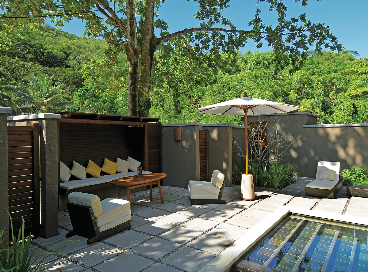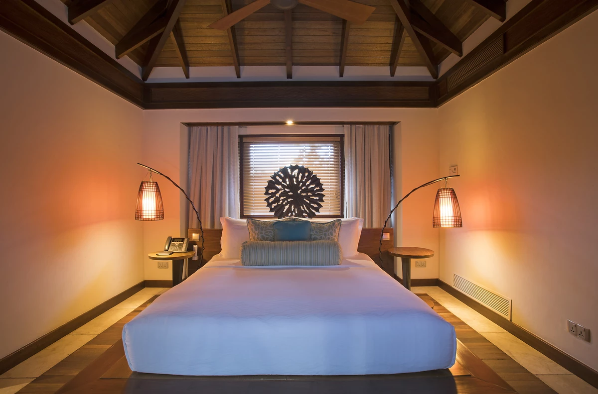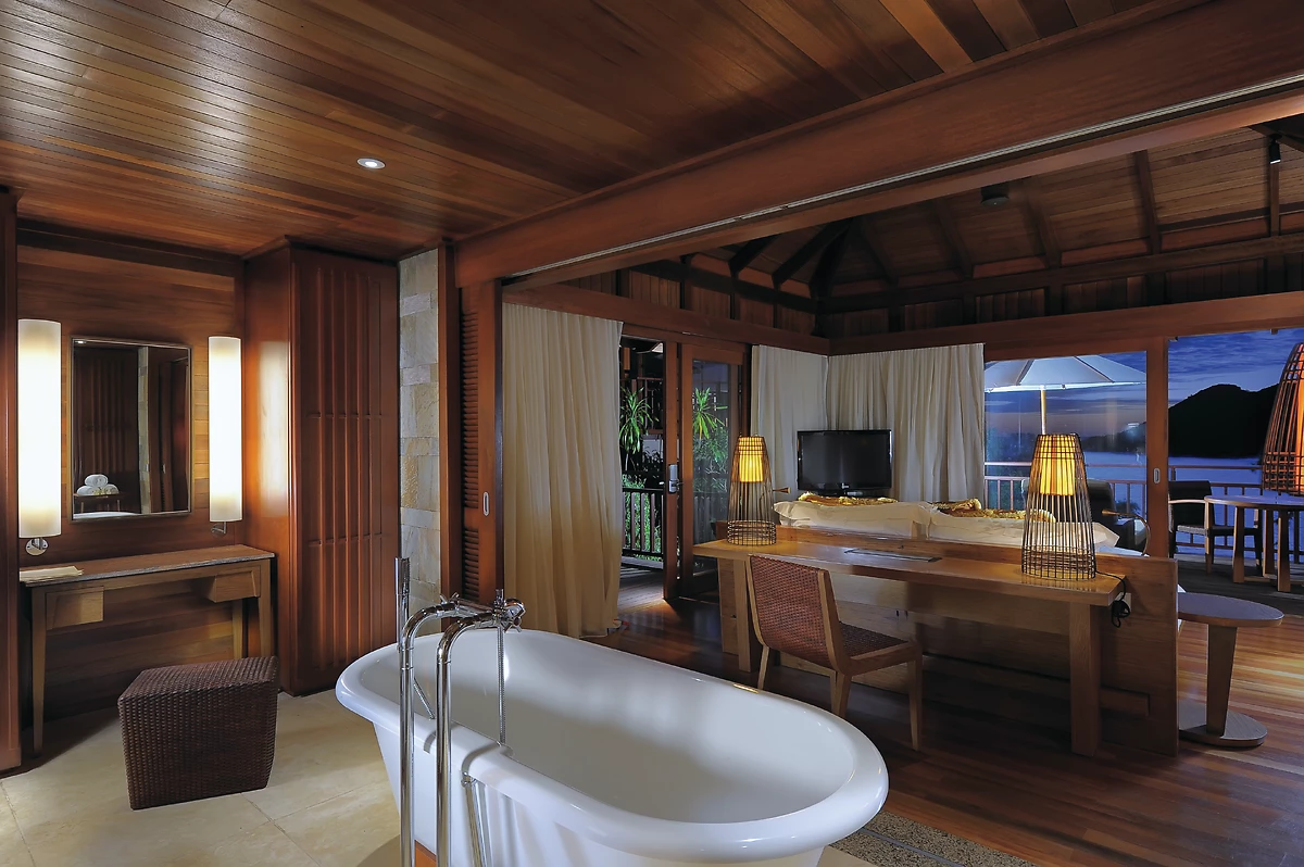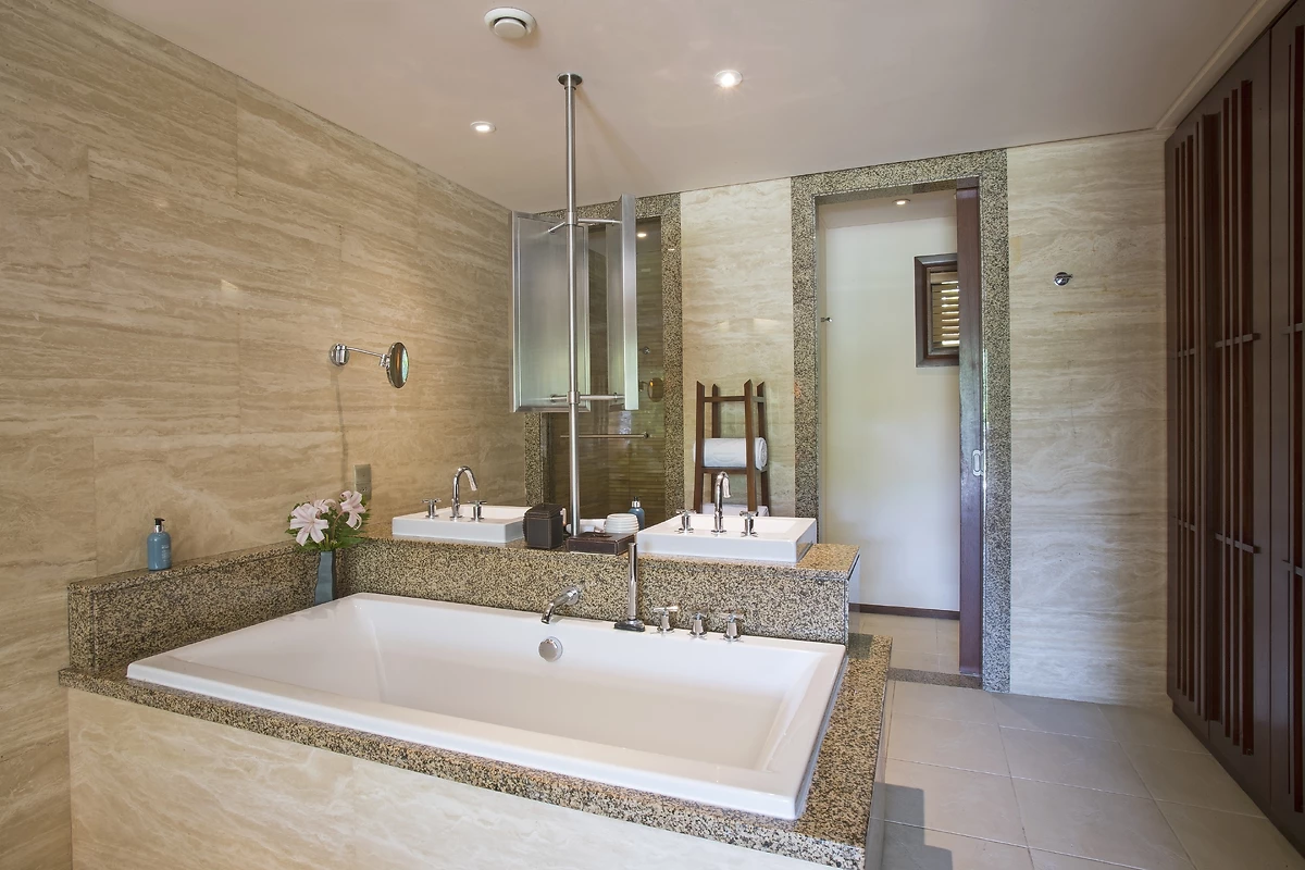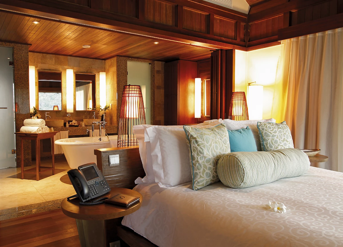 Ces vastes villas de 185 m² ont le privilège d’être situées à quelques pas seulement de la plage nord de Port Launay, l’une des plus belles de Mahé, sur laquelle s’étend le domaine de l’hôtel. Dotées d’une belle hauteur sous plafond et toit de chaume, leur décoration met en valeur les fines nuances naturelles du bois. Conçues avec un grand souci du détail, elles peuvent accueillir jusqu’à 2 adultes. Chaque résidence s’ouvre sur une cour intérieure verdoyante qui abrite une grande piscine et une pergola à l’abri des regards grâce aux murs de pierre qui la délimite. L’intérieur est aménagé avec une chambre comprenant un grand lit double et un salon séparé qui offre une vue dont vous ne pourrez vous lasser grâce aux grandes portes-fenêtres du sol au plafond. La salle de bains est composée d’une grande baignoire, d’une cabine de douche, d’une double vasque et d’un WC séparé. Une pièce entière est dédiée au dressing. Chaque villa est équipée d’une machine à café Nespresso bien achalandée, d’un réfrigérateur avec une sélection de vins et de vélos.