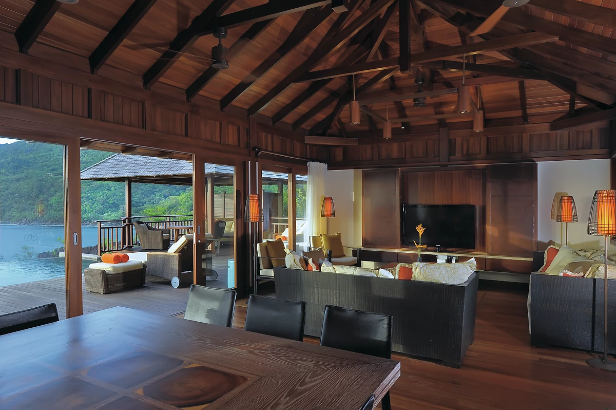 Ces villas offrent un cadre intimiste et absolument unique. Elles surplombent en effet le parc marin de Port Launay et sont dotées d’une vue imprenable, à quelques mètres de la plage seulement. Construites à même sur les majestueux rochers en granit typiquement seychellois, et adaptées à eux, elles disposent d’une superficie de 220 m² avec de grands volumes sous plafond mansardé. Conçues avec un souci poussé du détail, elles peuvent accueillir 4 adultes grâce à ses deux chambres. L’intérieur est aménagé avec un salon indépendant, agrémenté d’un canapé, de fauteuils, d’une table basse et d’un espace dinatoire en harmonie avec la chambre ouverte qui donne sur la terrasse aménagée avec son bureau. La salle de bains de la première chambre est pensée autour d’une baignoire îlot. Elle est également composée d’une cabine de douche, d’une double vasque, d’un espace dressing et d’un WC séparé. La deuxième chambre dispose elle aussi d’un accès direct à la terrasse et de sa propre salle de bains avec baignoire îlot, cabine de douche, double vasque, espace dressing et WC séparé. La grande terrasse en bois offre un bel espace d’extérieur garni de lits de plage avec parasols et une très belle piscine à débordement d’où l’on ne se lassera de contempler la vue extatique sur le parc marin. Une pergola indépendante reliée aux villas invite à des séances de Spa pour une détente maximale à l’abri des regards. Chaque villa est équipée d’une machine à café Nespresso, d’un réfrigérateur contenant une sélection de vins, d’une voiturette électrique et met à disposition un service en chambre 24h/24.