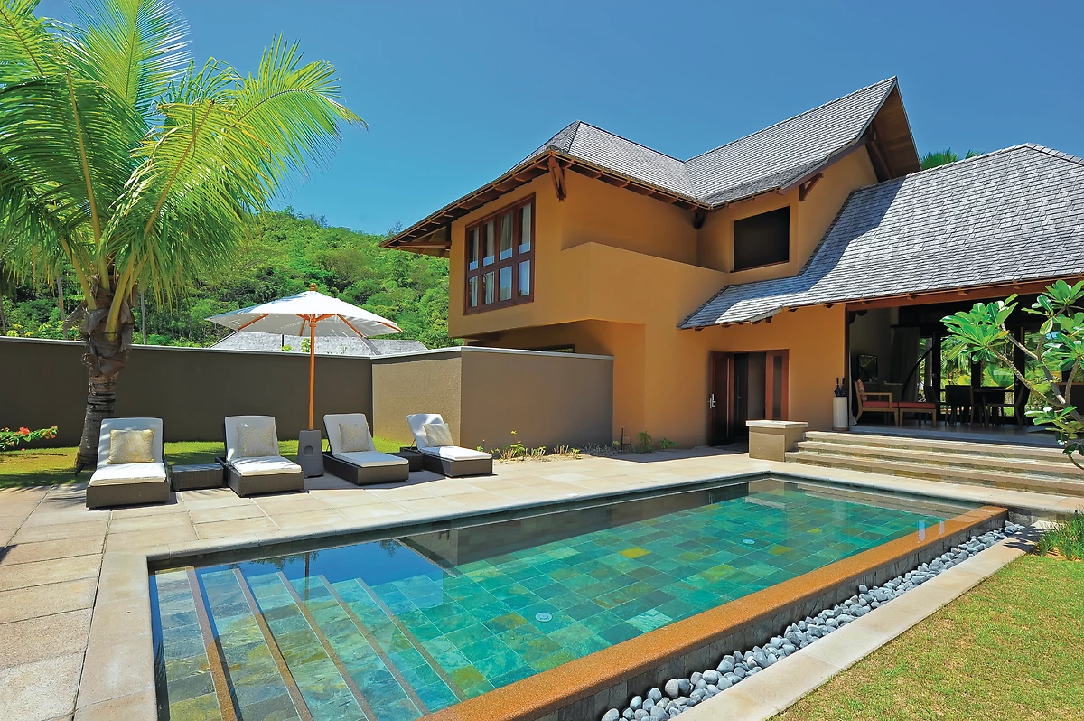 Ces vastes villas de 370 m² ont le privilège d’être situées à quelques pas seulement de la plage nord de Port Launay, l’une des plus belles de Mahé, sur laquelle s’étend le domaine de l’hôtel. Dotées d’une belle hauteur sous plafond et toit de chaume, leur décoration met en valeur les fines nuances naturelles du bois. Conçues avec un grand souci du détail, elles peuvent accueillir jusqu’à 4 adultes et 2 enfants de moins de 13 ans (+1 berceau). Chaque résidence s’ouvre sur une cour intérieure verdoyante qui abrite une grande piscine et une pergola à l’abri des regards grâce aux murs de pierre qui la délimite. Le rez-de-chaussée est aménagé avec une chambre comprenant un grand lit double et un salon séparé qui offre une vue dont vous ne pourrez vous lasser grâce aux grandes portes-fenêtres du sol au plafond. La salle de bains est composée d’une grande baignoire, d’une cabine de douche, d’une double vasque et d’un WC séparé. Une pièce entière est dédiée au dressing. La 2e chambre à l’étage dispose elle aussi de son propre dressing et d’une salle de bains avec double vasque, baignoire, cabine de douche et WC séparé. Chaque villa est équipée d’une machine à café Nespresso bien achalandée, d’un réfrigérateur avec une sélection de vins et de vélos.