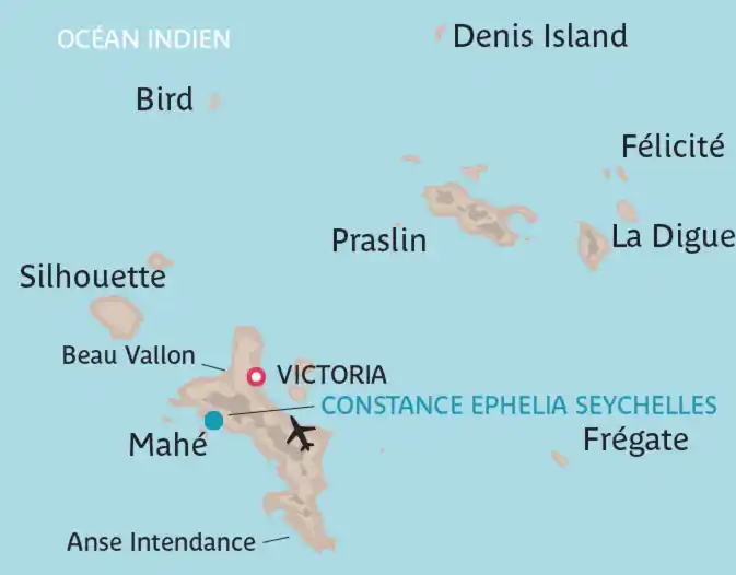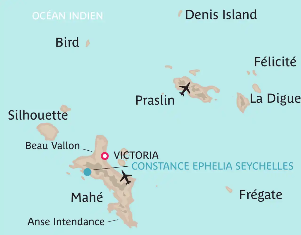 À 40 min de l’aéroport, au nord-ouest de Mahé, à Port Launay.