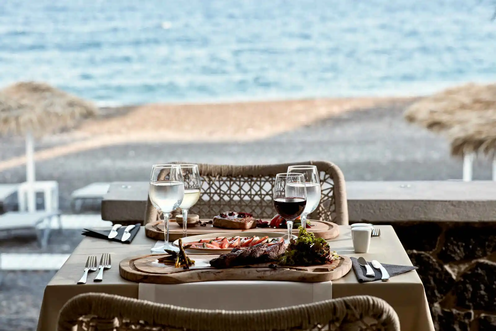 Situé à 10 minutes de l’aéroport de Santorin, cet hôtel offre un cadre raffiné en bord de mer, sur la plage de sable noir de Kamari. Il combine charme cycladique, confort moderne et prestations haut de gamme, pour un séjour inoubliable au cœur de l’île.