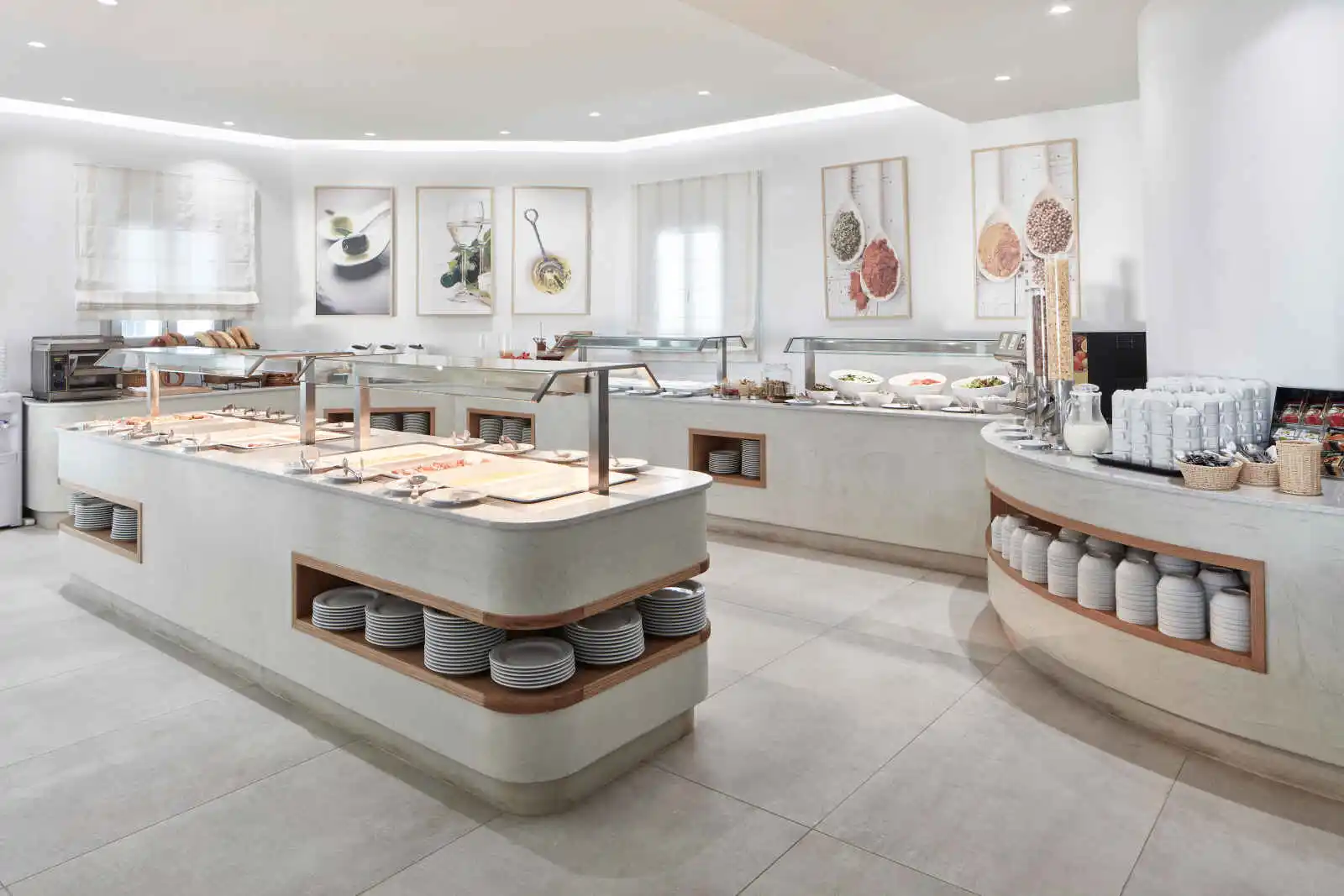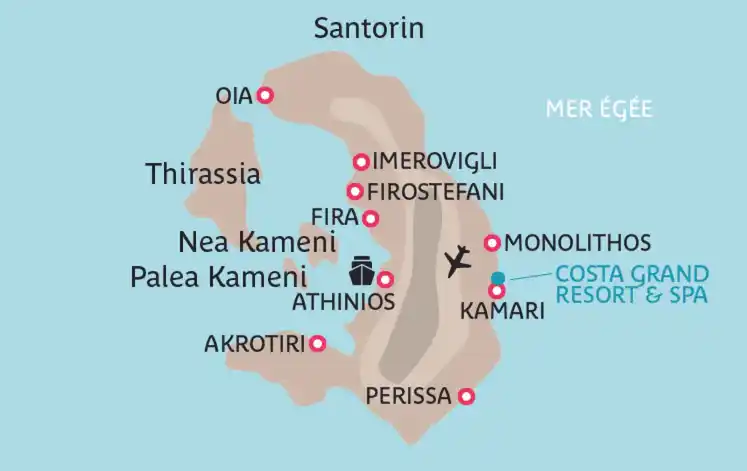 Situé à 4 km de l’aéroport, au bord des plages de Kamari.