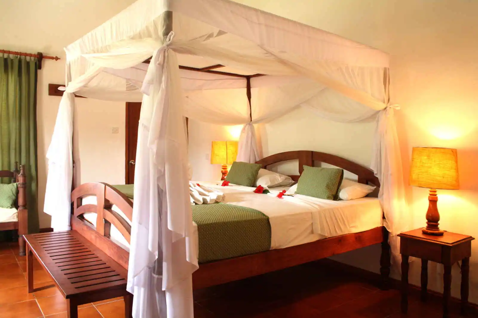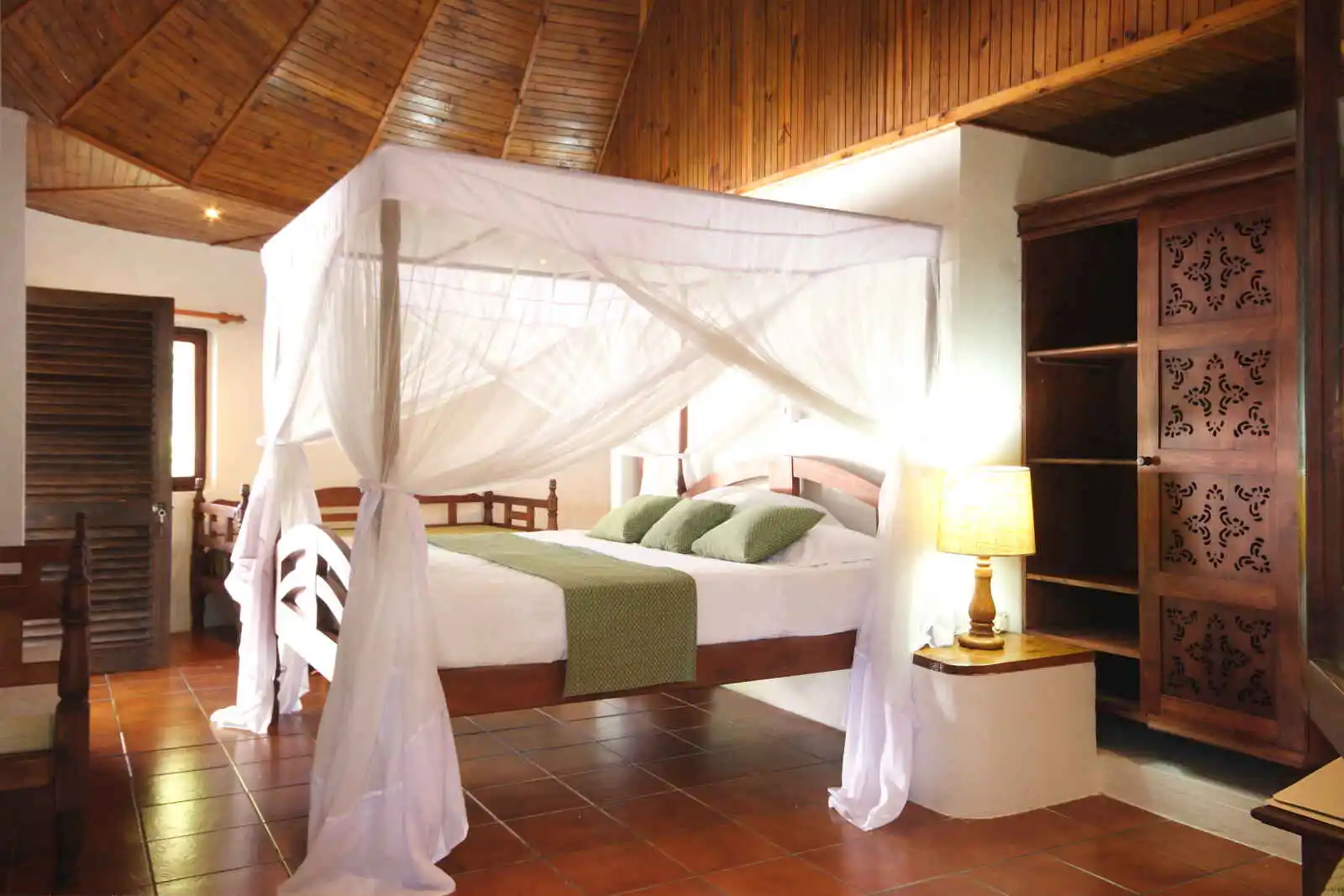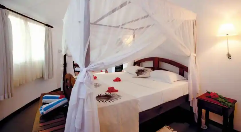 Chambres doubles (vue jardin et front de mer) avec un lit à baldaquin, équipées de téléphone, mini-bar, coffre-fort, sèche-cheveux, ventilateur au plafond, climatisation, petite véranda.