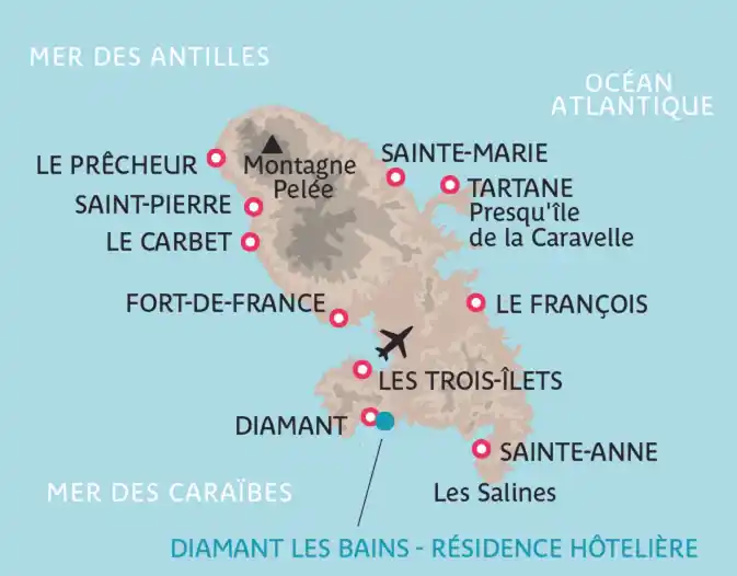 À 25 min de l’aéroport et 30 min de Fort-de-France. Sur la plage du Diamant et à 5 min à pied du centre-ville du Diamant. Anse d’Arlet à 10 min.