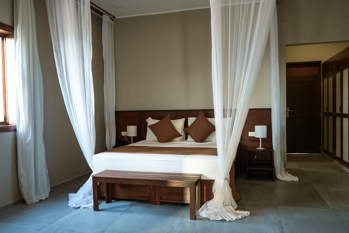 30 villas de 40 à 45 m² pouvant accueillir 3 adultes et 1 enfant ou 2 adultes et 2 enfants, avec télévision et lit à baldaquin ou lits jumeaux.