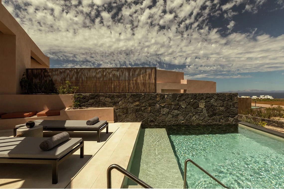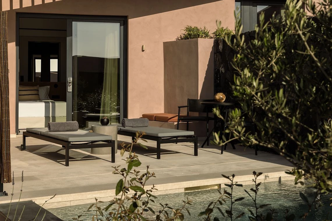 D’une superficie de 30 m² minimum, cette chambre peut accueillir 2 adultes. Elle comprend un minibar, une douche à l’italienne, un lit king-size, une salle de bains moderne, un coin salon et une terrasse avec piscine privée flanquée d’un mur en pierre volcanique.