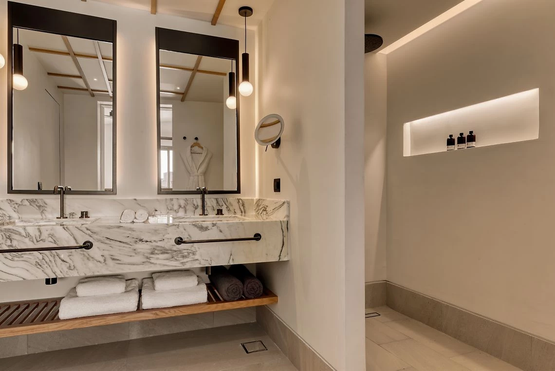 D’une superficie de 35 m² minimum, cette chambre peut accueillir 2 adultes et 1 enfant. Elle comprend un minibar, une douche à l’italienne, un lit king-size, un canapé d’appoint, une salle de bains moderne, un coin salon et une terrasse avec piscine privée flanquée d’un mur en pierre volcanique donnant une vue sur la mer pour profiter des couchers de soleil de Santorin.