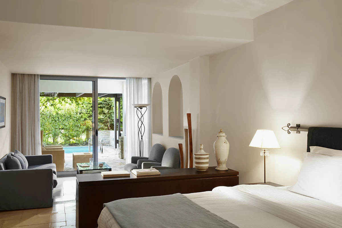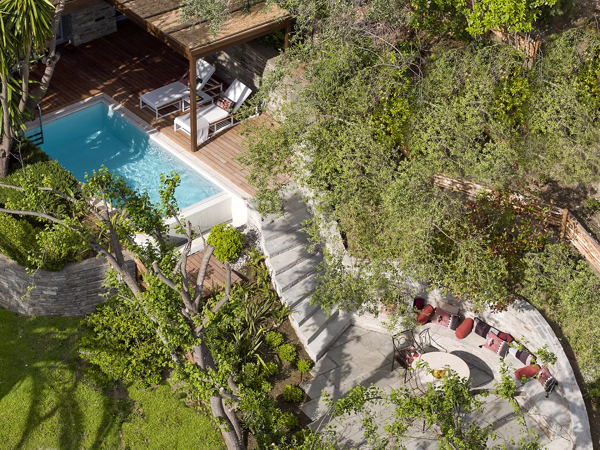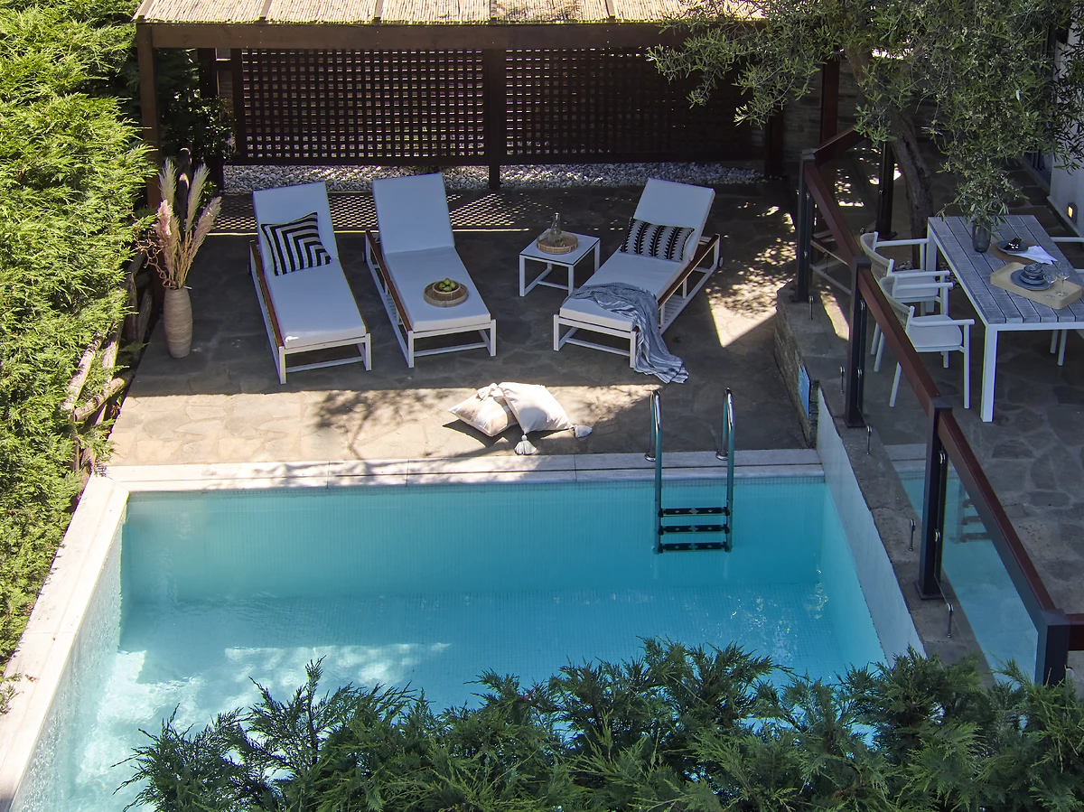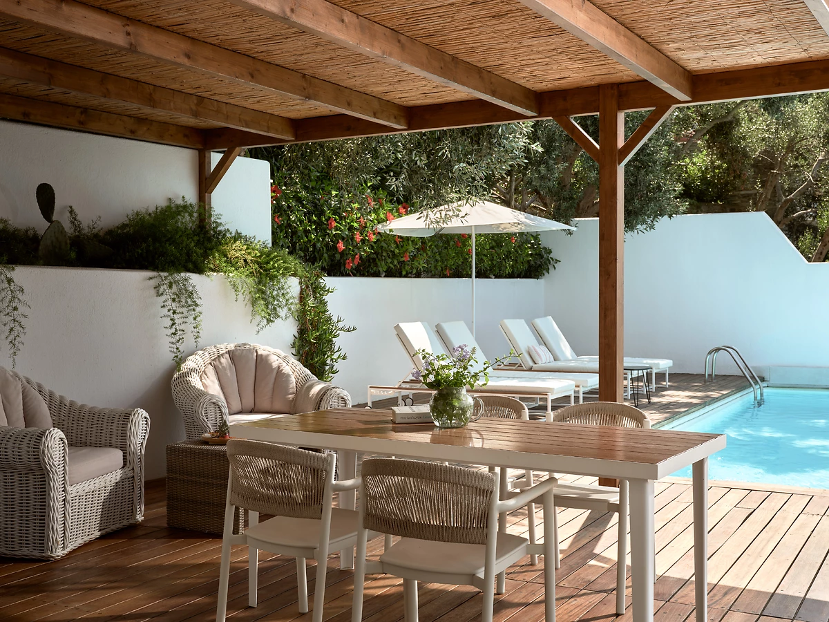 Suite Nero 80 m², pouvant accueillir 2 adultes et 2 enfants, avec piscine privée. Vue jardin.