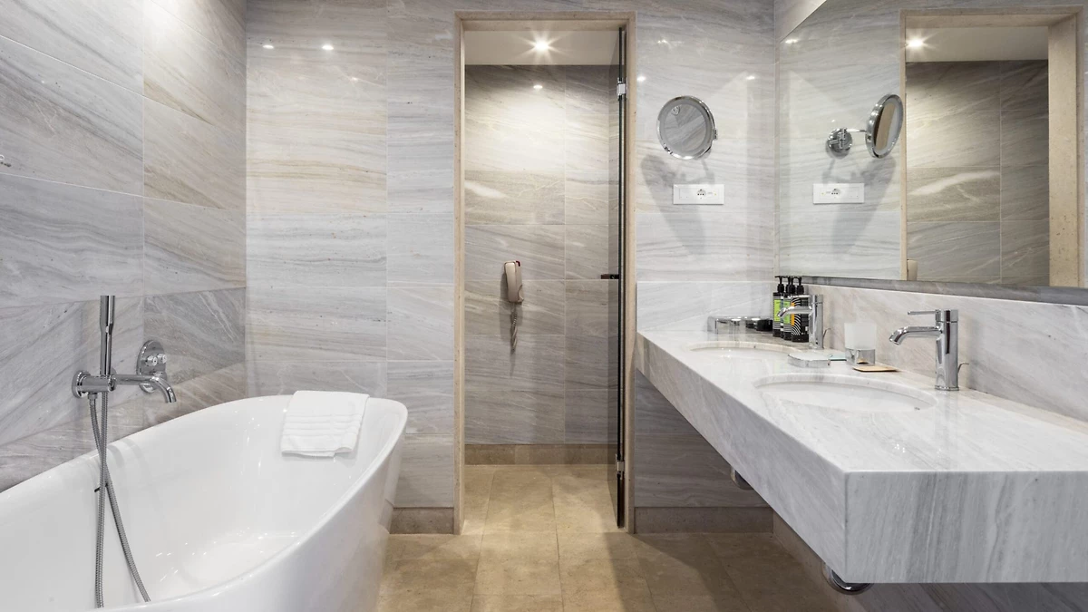 • Luxueuses salles de bains en marbre avec baignoire, douche à l'italienne, audio, téléphone, chauffe-serviettes, miroirs de maquillage/de rasage, peignoirs, pantoufles et produits de bain de marque.