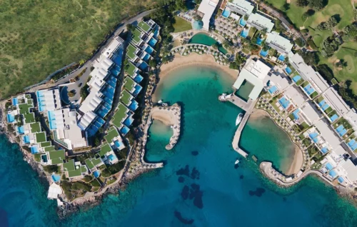Vue aérienne de l'hôtel, Elounda Peninsula Luxury Resort, Crète, Grèce