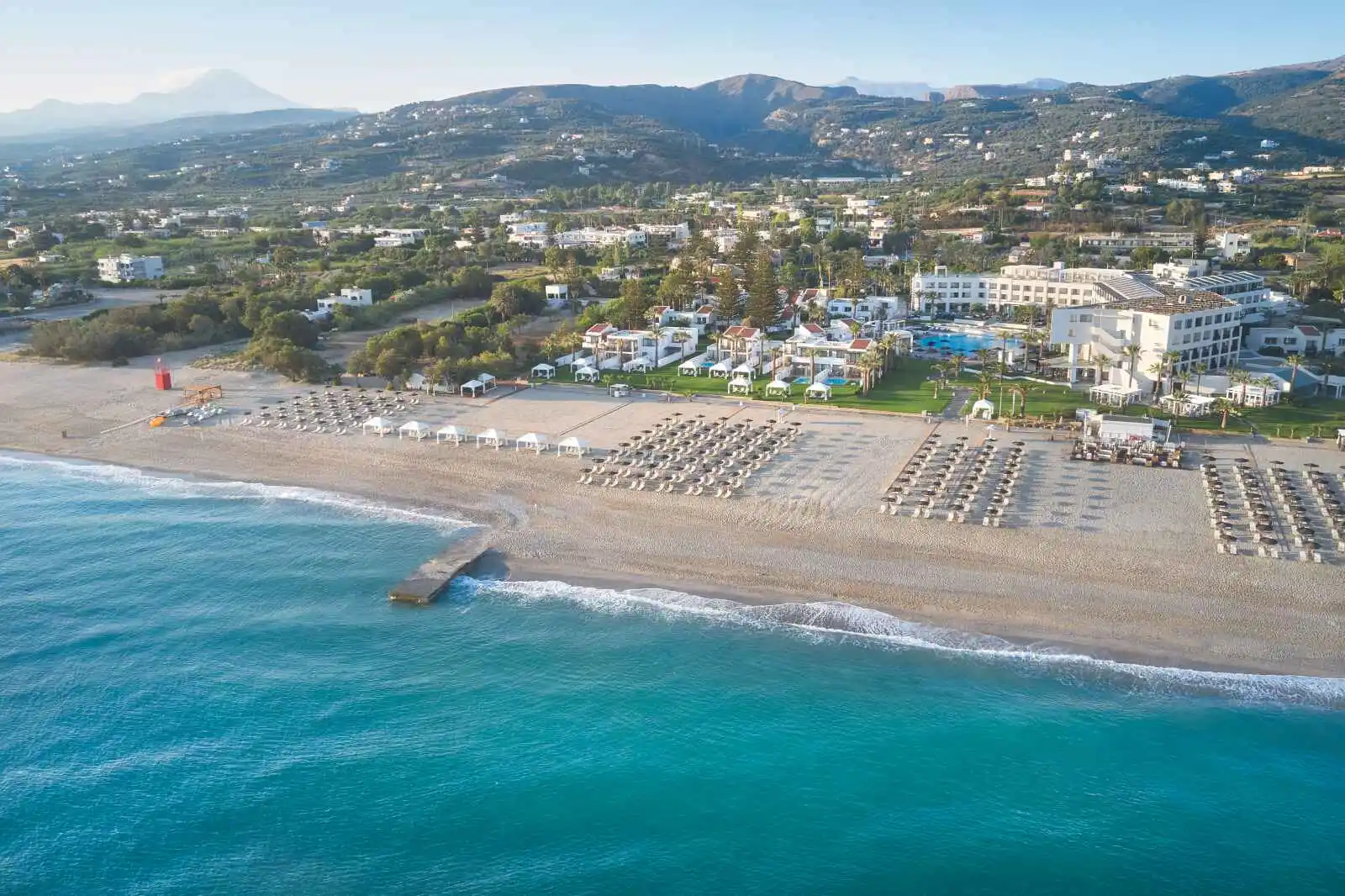 À 1 h environ de l’aéroport d’Héraklion ou de celui de La Chanée, au calme sur une plage de sable blond mais à proximité immédiate de la ville de Réthymnon et de ses animations.