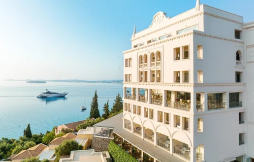 Entouré de jardins exotiques parfumés, cet hôtel est un véritable Eden. Le Grecotel Eva Palace est perché sur une colline de la péninsule de Kommeno, à seulement 12 kilomètres de la ville de Corfou, et offre une vue imprenable sur les jolis villages côtiers et les petites îles qui parsèment la mer Ionienne entre Corfou et le continent. Des Bungalows et des Villas corfiotes aux couleurs chatoyantes se trouvent au milieu de jardins matures, regorgeant d'oliviers et de végétation tropicale.