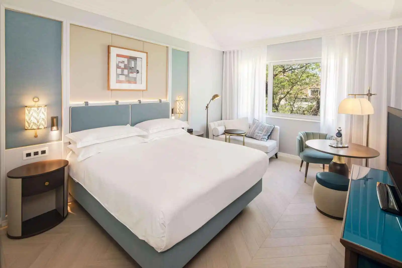 Vue jardin ou ville. 43 m²; 1 lit double; parquet, coin salon, salle de bain en marbre avec douche ou baignoire, peignoirs. Accès à l’Executive Lounge.