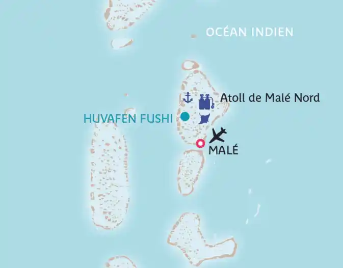 À 35 min de l’aéroport de Malé en bateau rapide.