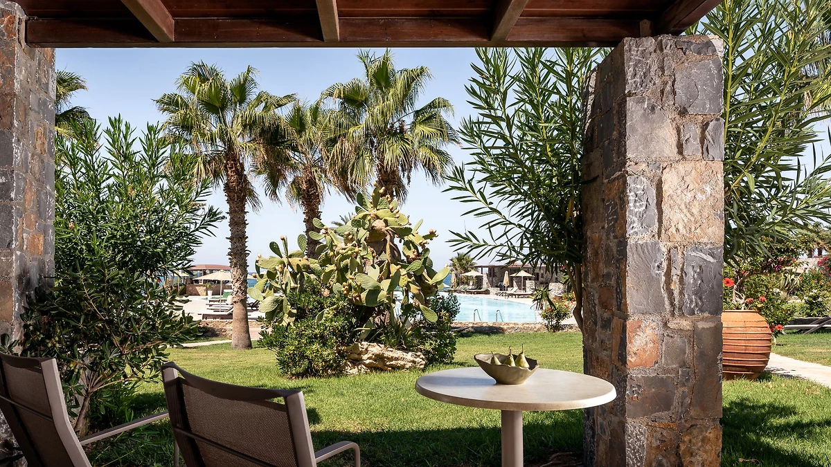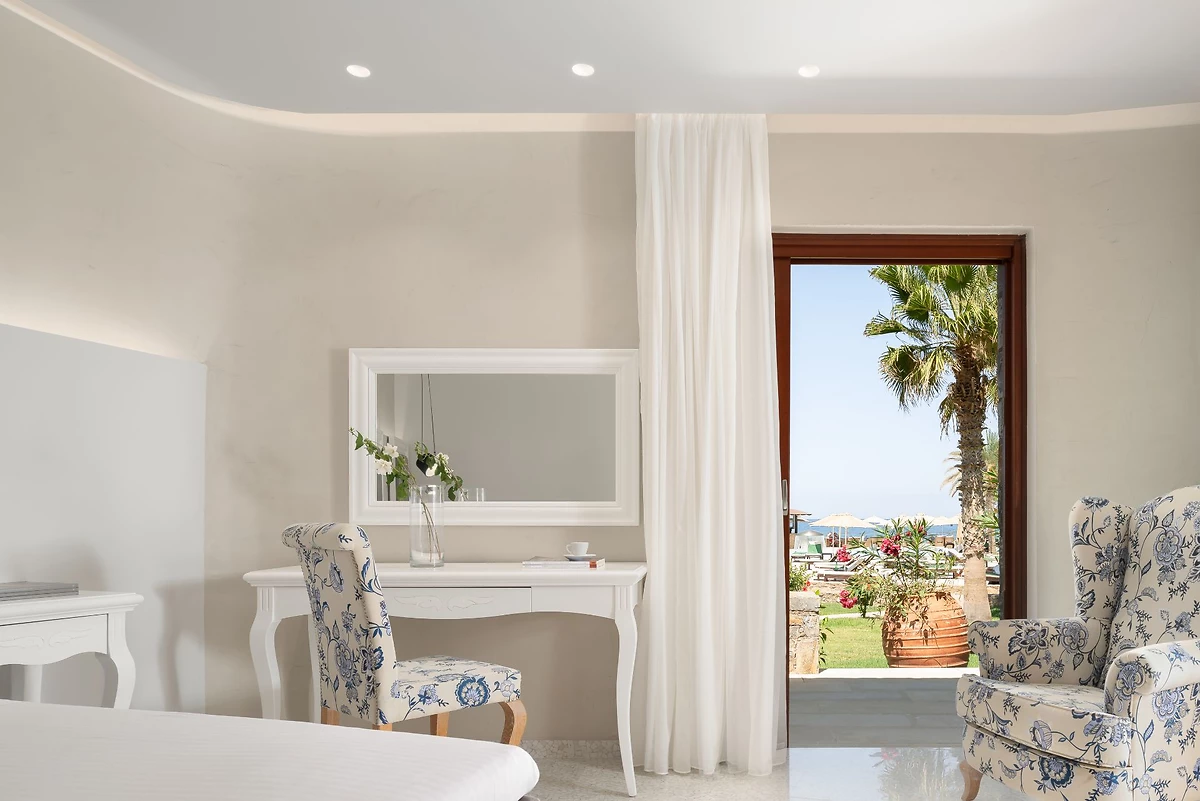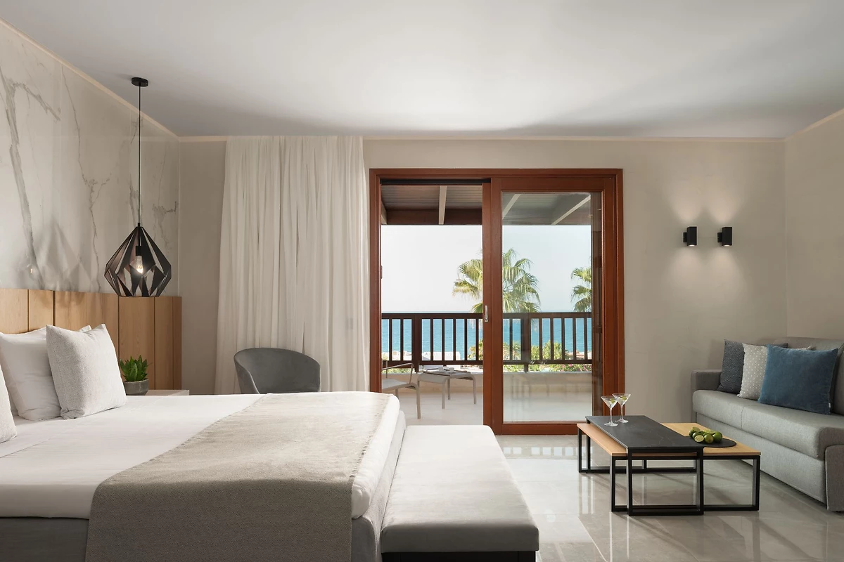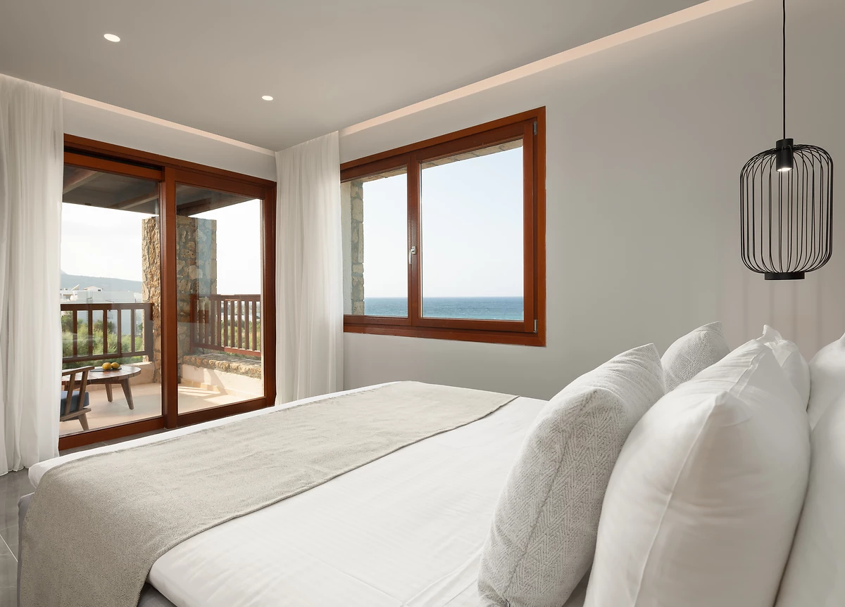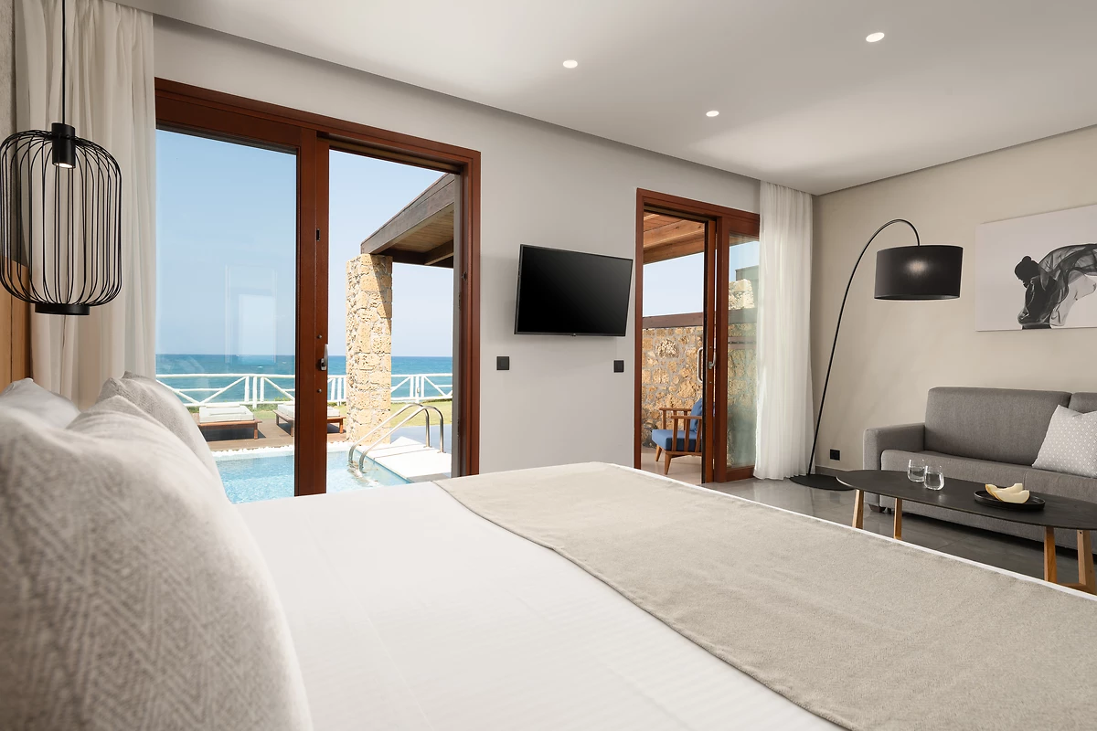 Cette grande et luxueuse suite en front de mer peut accueillir 3 personnes, possède un coin salon avec canapé-lit et une superbe salle de bain avec douche à l’italienne. Avec sa décoration minimaliste et de très bon goût, voilà un incroyable pied-à-terre qui s’ouvre sur une superbe terrasse avec transats, piscine privée et vue sur mer.