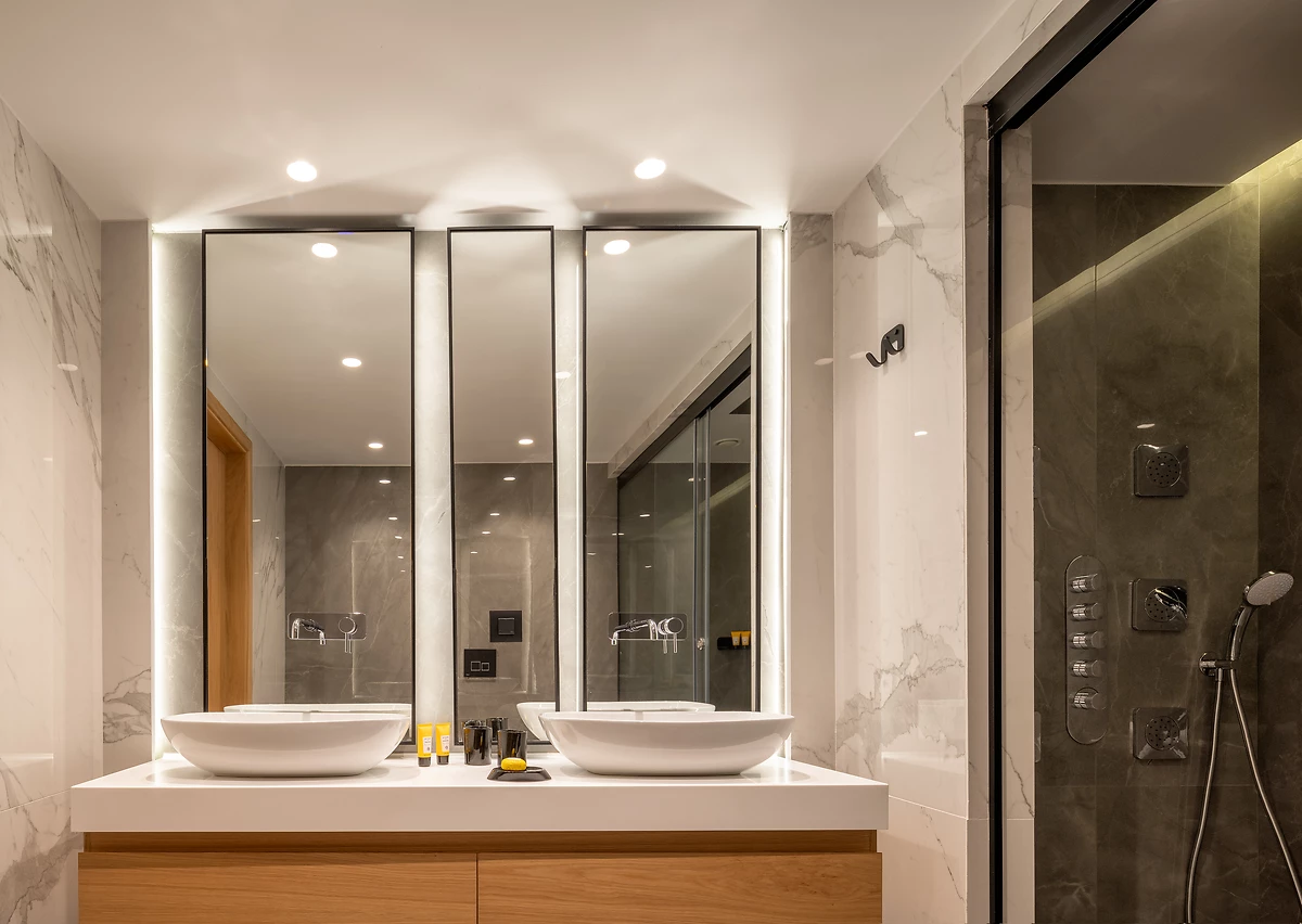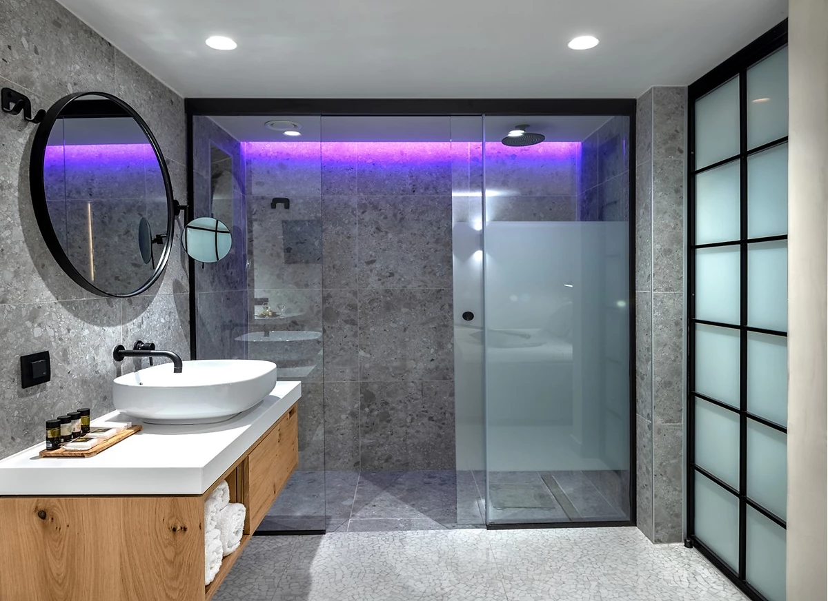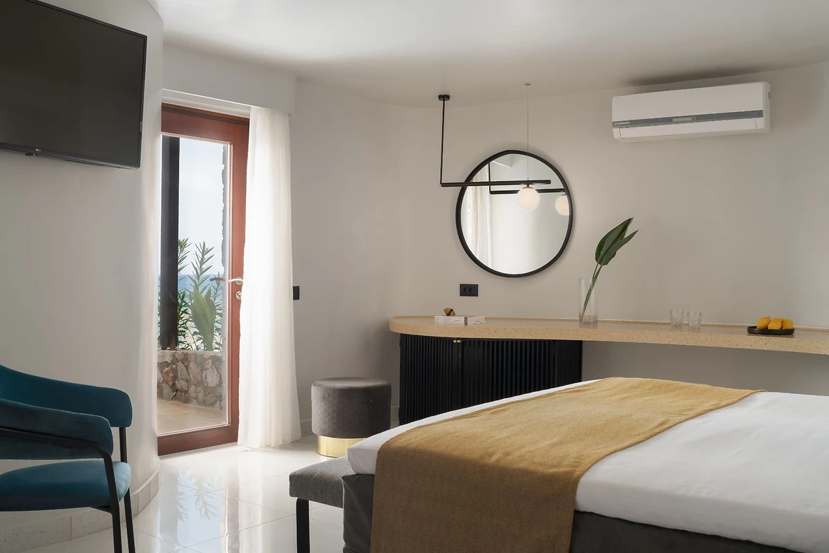 La chambre double Ikaros classique peut accueillir 3 personnes avec un lit double et un lit d’appoint. Avec une douche à l’italienne et une superbe décoration contemporaine avec des tons gris et terreux, voilà un beau pied-à-terre qui s’ouvre sur un balcon ou une terrasse avec vue sur mer.