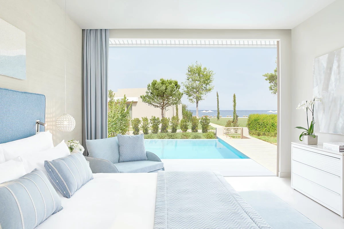 Suite de 100 m², pouvant accueillir 2 adultes et 4 enfants, avec vue piscine ou mer.