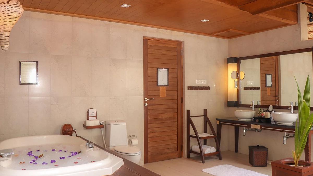 Ces bungalows de 54 m² simples et confortables sont situés sur la plage, avec une vue mer, dans un cadre verdoyant et paisible car un peu à l’écart des parties communes de l’hôtel. Ils peuvent accueillir 3 adultes ou 2 adultes et 1 enfant. Chaque chambre est ornée de tons vifs et de sols carrelés qui apportent de la fraîcheur. La chambre ouverte comprenant un lit king-size à baldaquin avec une moustiquaire, un coin bureau/boudoir ainsi que deux fauteuils accompagnés d’une table basse. L’arrière-cour abrite une salle d’eau semi-ouverte équipée d’une douche, d’un WC et d’une vasque. La terrasse extérieure est aménagée avec un coin repos et deux lits de plage individuels. Chaque villa dispose de l’air conditionné, d’un ventilateur de plafond, d’une machine à café espresso, d’un minibar, d’une barre de son et d’un coffre-fort.