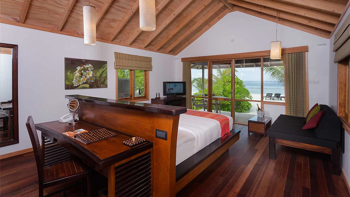 Ces coquettes villas de 57 m² aux lignes épurées et au style contemporain sont conçues pour accueillir jusqu’à 3 adultes ou 2 adultes et 2 enfants. Elles occupent une position privilégiée en première ligne face au lagon sur la plage principale, dans la partie sud de l’île et à proximité des commodités du resort. Pourvues d’une véranda ombragée, elles offrent un accès direct à la plage agrémenté de deux lits de plage individuels et d’un espace de détente. À l’intérieur, la chambre ouverte sur la terrasse est élégamment décorée et rehaussé des tonalités de blanc et de bois sombre (à l’image de son parquet) ou clair (à l’image de son plafond mansardé, de ses huisseries et portes de dressing). Elle comporte un lit king-size à baldaquin orné d’une moustiquaire et un coin bureau. Chaque villa dispose de l’air conditionné, d’un ventilateur de plafond, d’un minibar, d’une machine à café espresso, d’une TV écran plat, d’une barre de son et d’un coffre-fort.